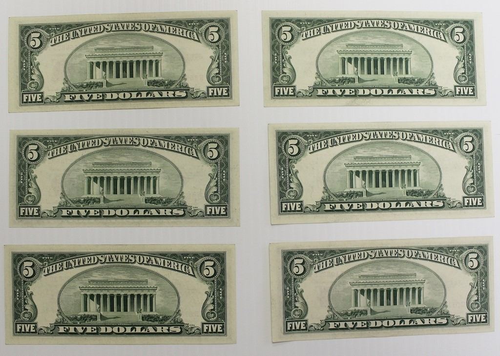 6 PCS. 1953-A $5.00 UNITED STATES NOTES