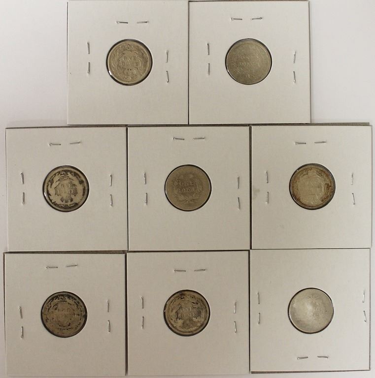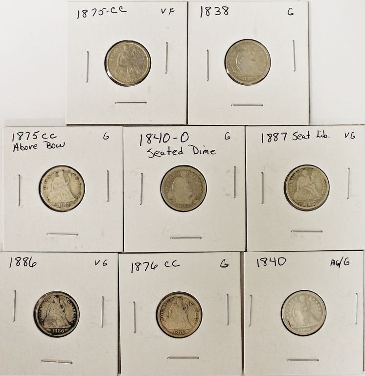 1838 GOOD, 1840 GOOD, 1840-O GOOD, 1875-CC ABOVE BOW GOOD, 1875-CC VF, 1876-CC GOOD, 1886 VG, AND 1887 VG. ESTIMATE: $125-$150