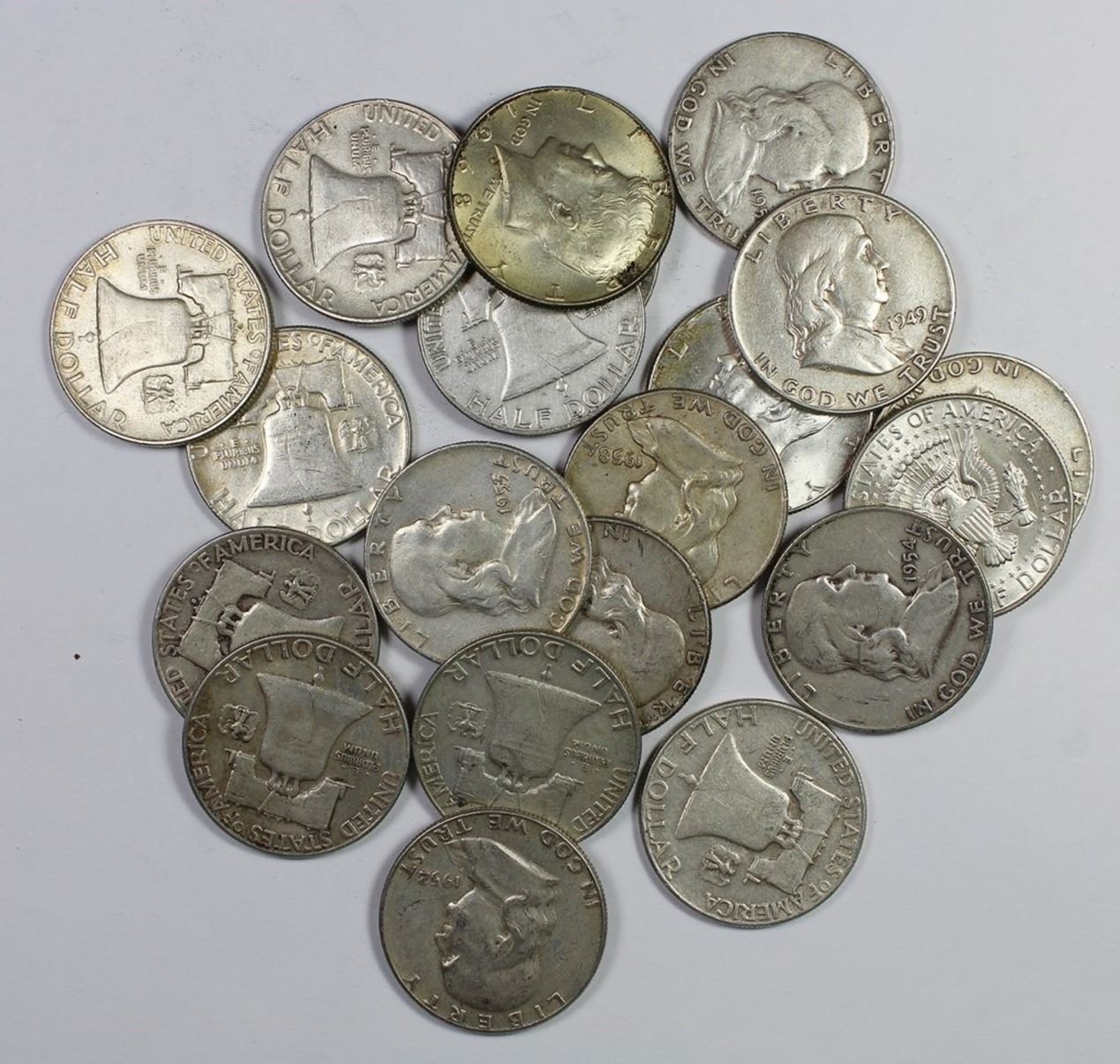 (17) FRANKLIN HALF DOLLARS AND (3) KENNEDY HALF DOLLARS 40% SILVER. ESTIMATE: $120-$150
