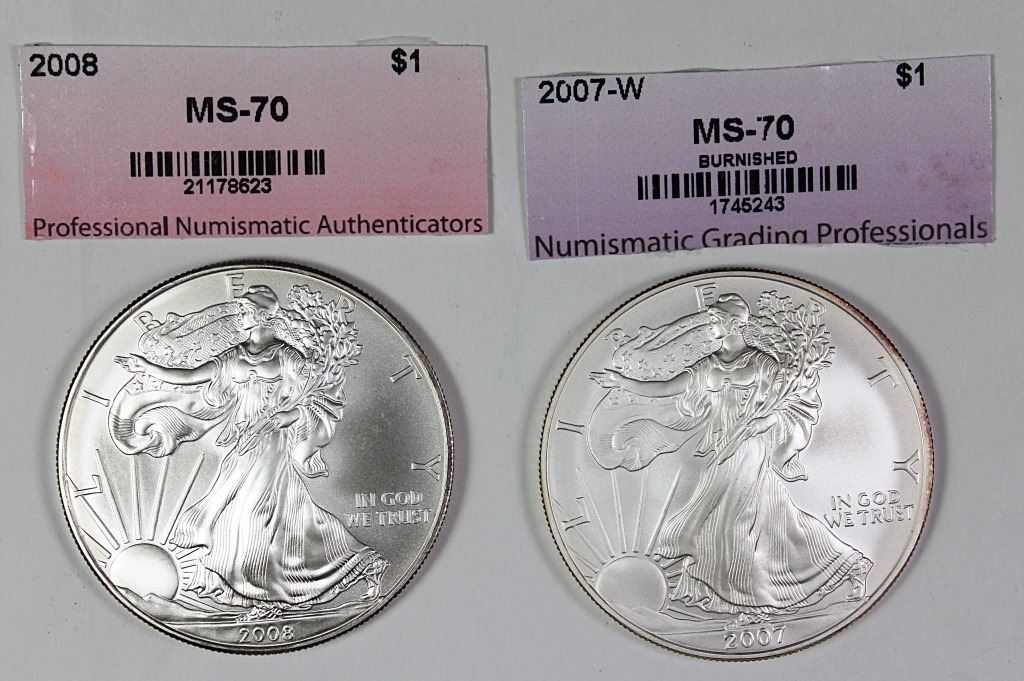 CERTS ONLY: 2008 PNA MS 70, 2007-W NGP MS 70. ESTIMATE: $200-$250