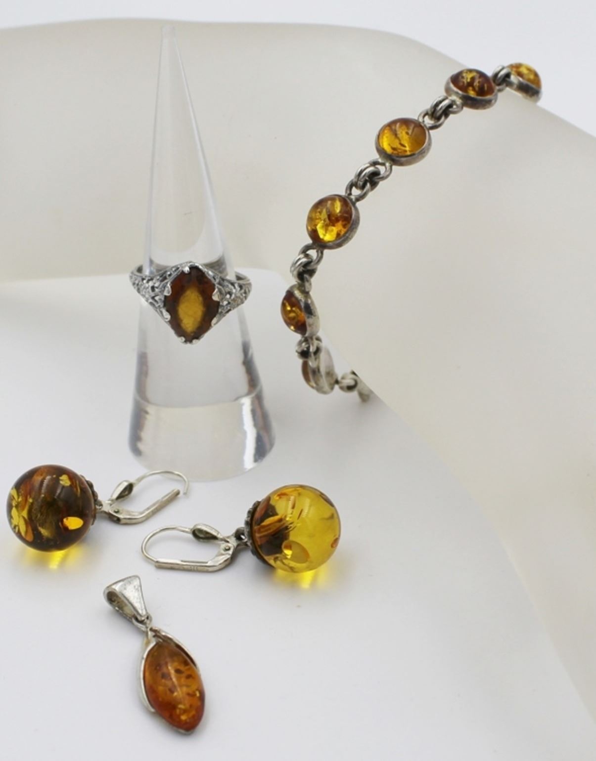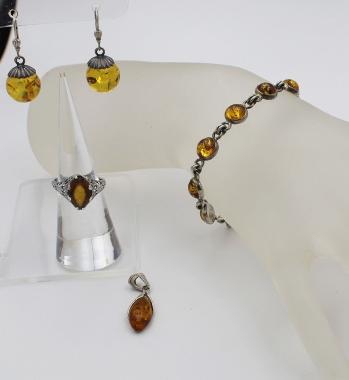 INCLUDES RING SIZE 7, DANGLY EARRINGS WITH PIERCED EARS, LONG OVAL PENDANT AND 7" LONG BRACELET. PRE-OWNED. 17.5 GRAMS TOTAL WEIGHT. ESTIMATE: $100-$125