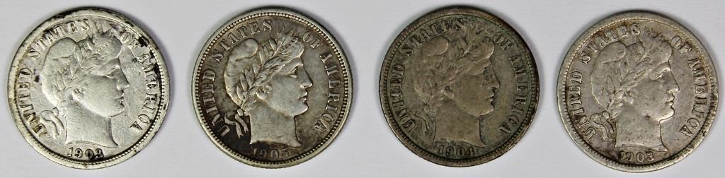 1903 VF, 1903-O VF, 1904 XF AND 1905 XF-AU. ESTIMATE: $85-$110