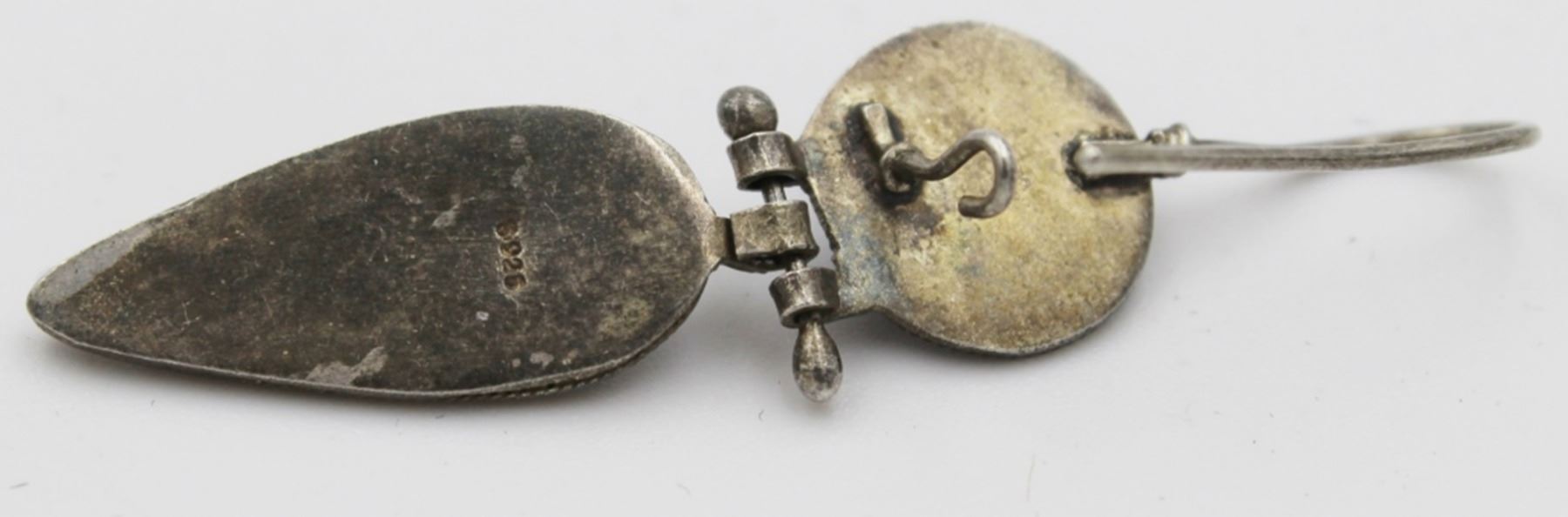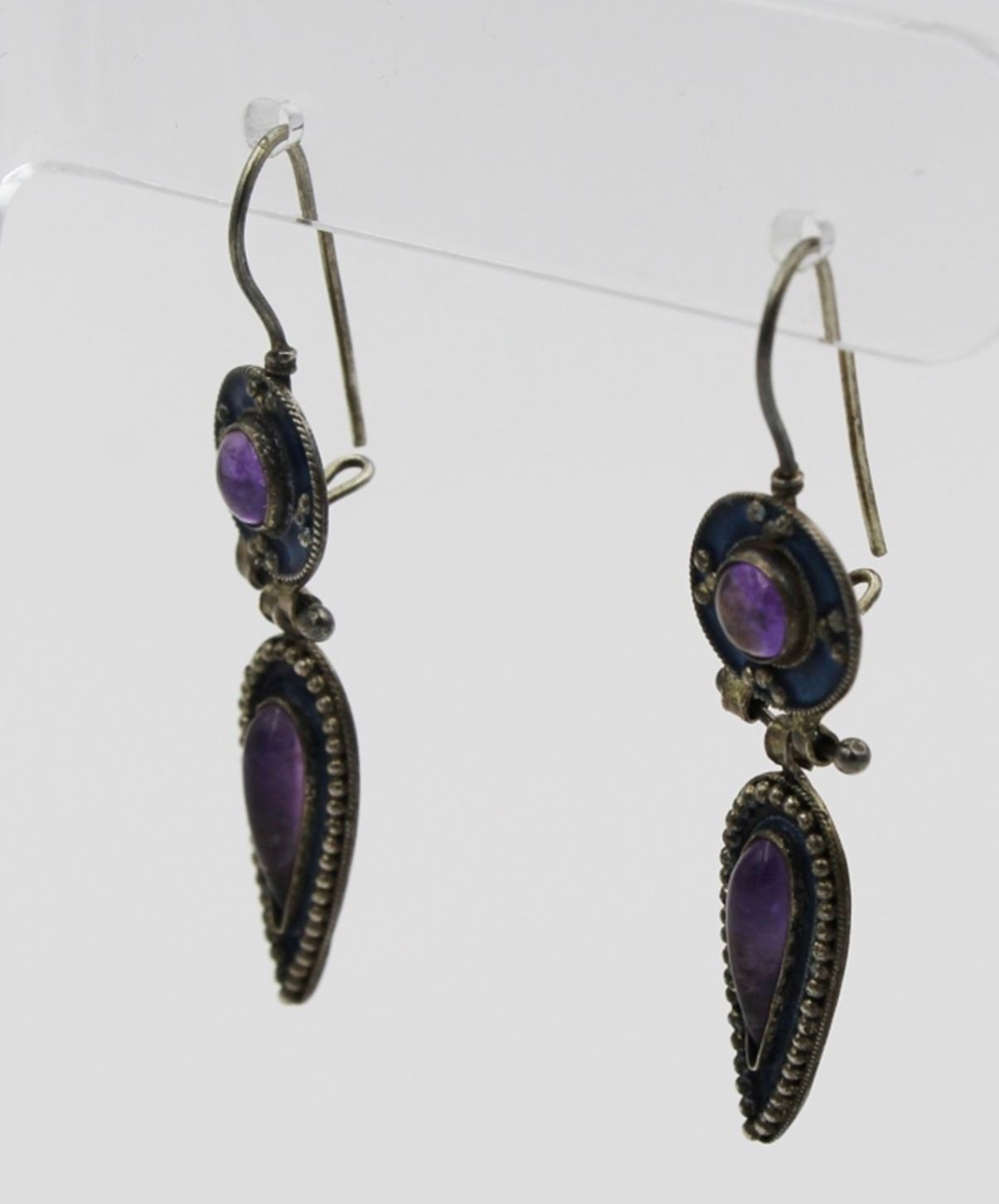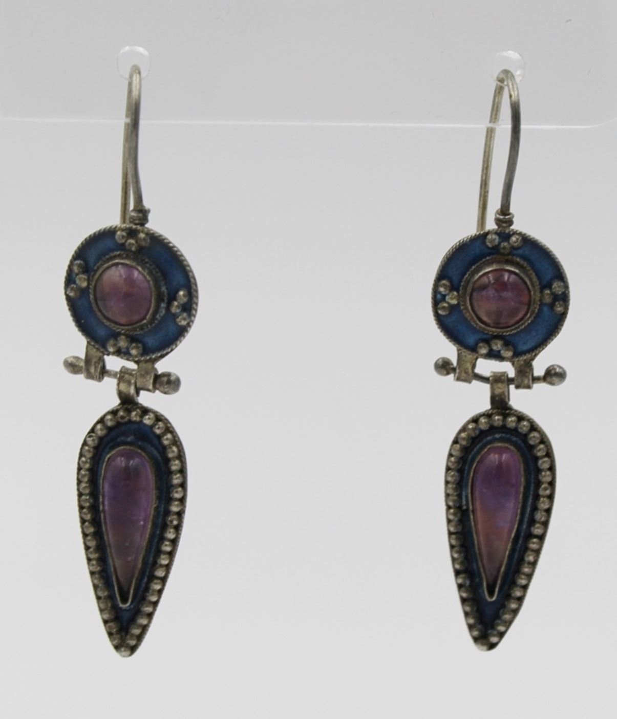BEAUTIFUL AZTEC STYLE STERLING SILVER EARRINGS FOR PIERCED EARS. BLUE ENAMEL WITH PURPLE STONES. PRE-OWNED. 2.7 GRAMS. ESTIMATE: $50-$60