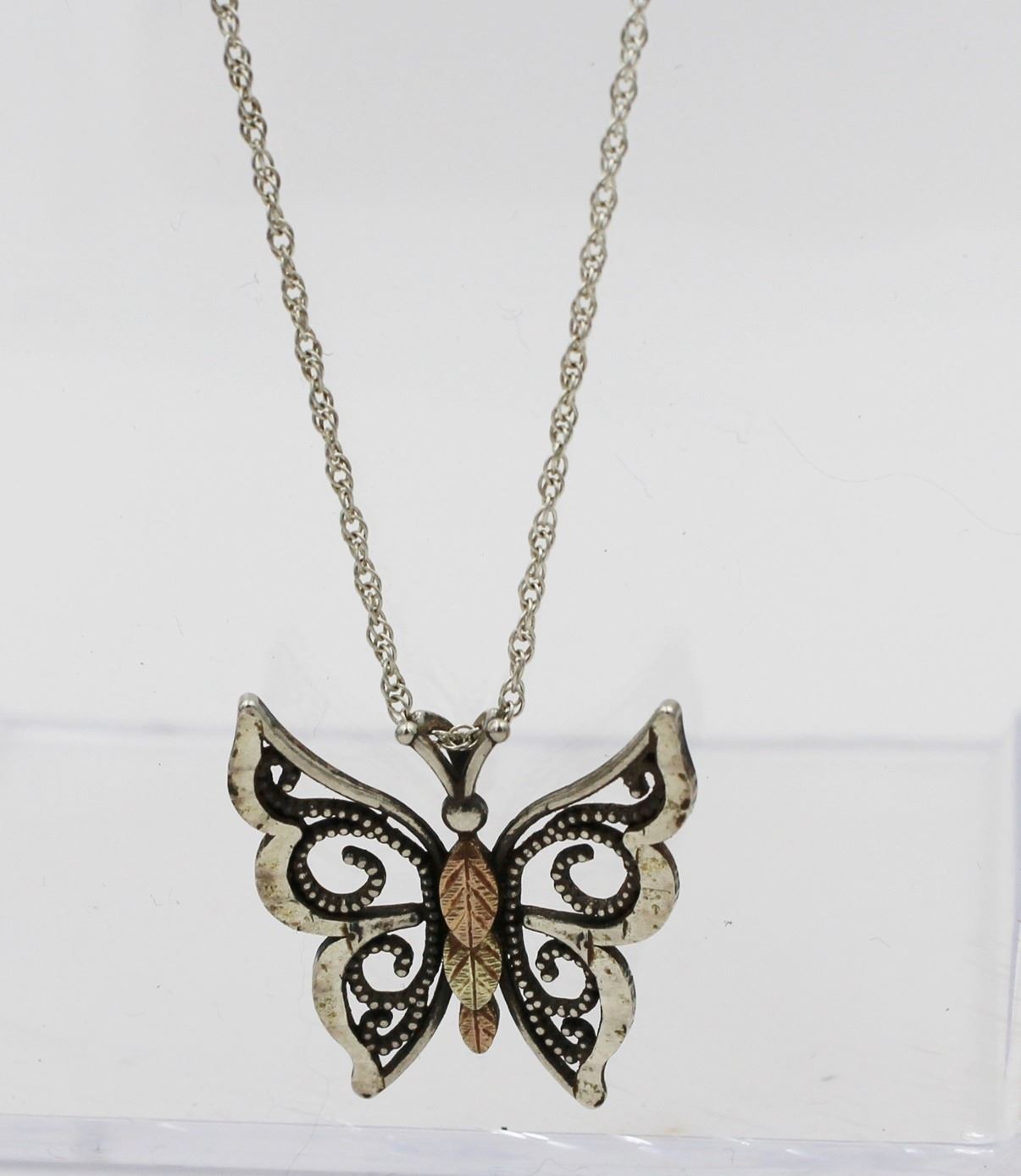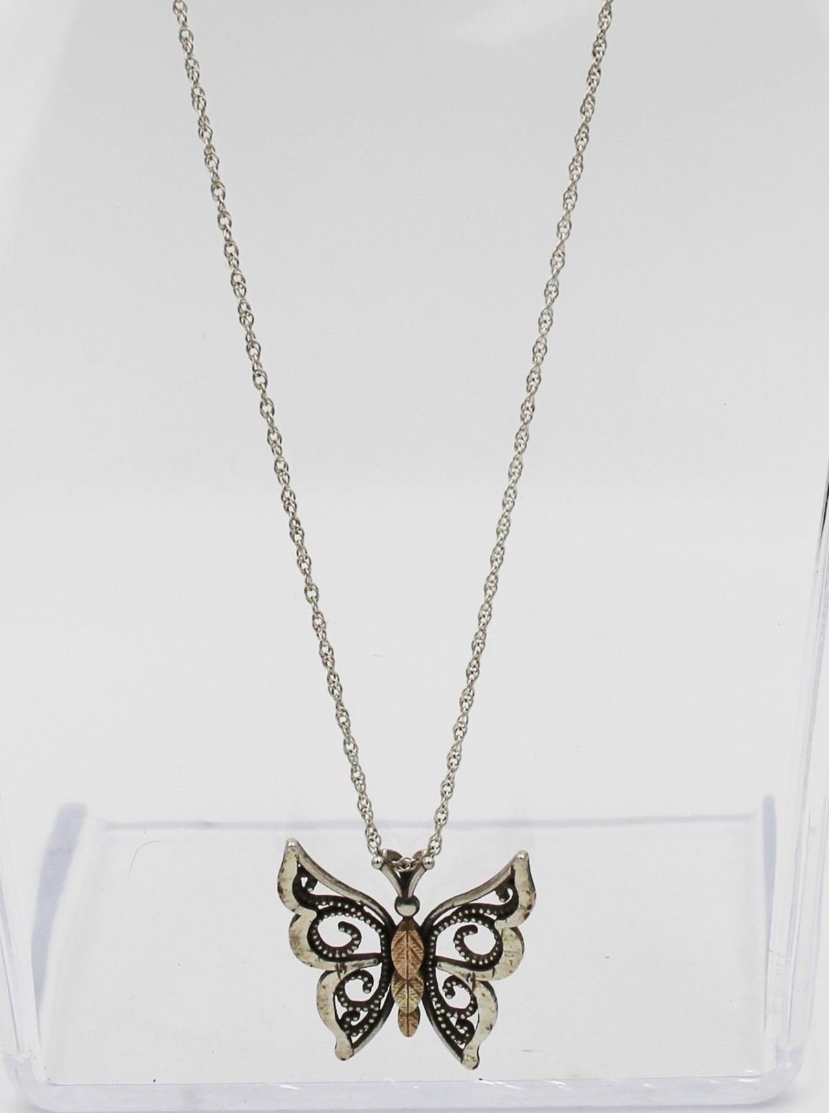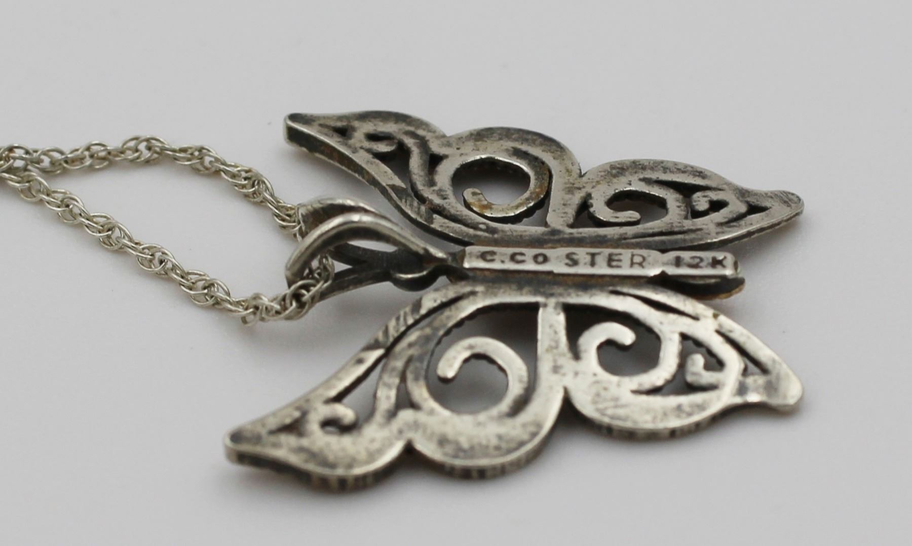 C. CO. STERLING SILVER AND 12K BUTTERFLY NECKLACE. BEAUTIFUL STERLING SILVER BUTTERFLY WITH FINE 12K DETAILING DOWN THE BODY. 18" CHAIN. 3.5 GRAMS TOTAL. PRE-OWNED. ESTIMATE:$75-$100