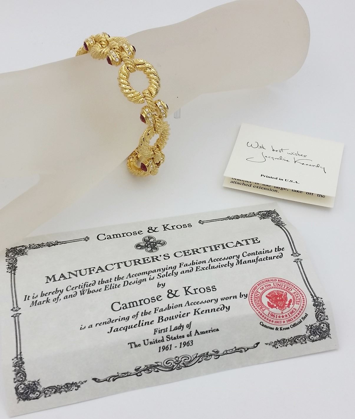 CAMROSE & KROSS JACQUELINE BOUVIER KENNEDY GOLD TONE BRACELET IN BOX. LIKE NEW. ESTIMATE:$150-$200