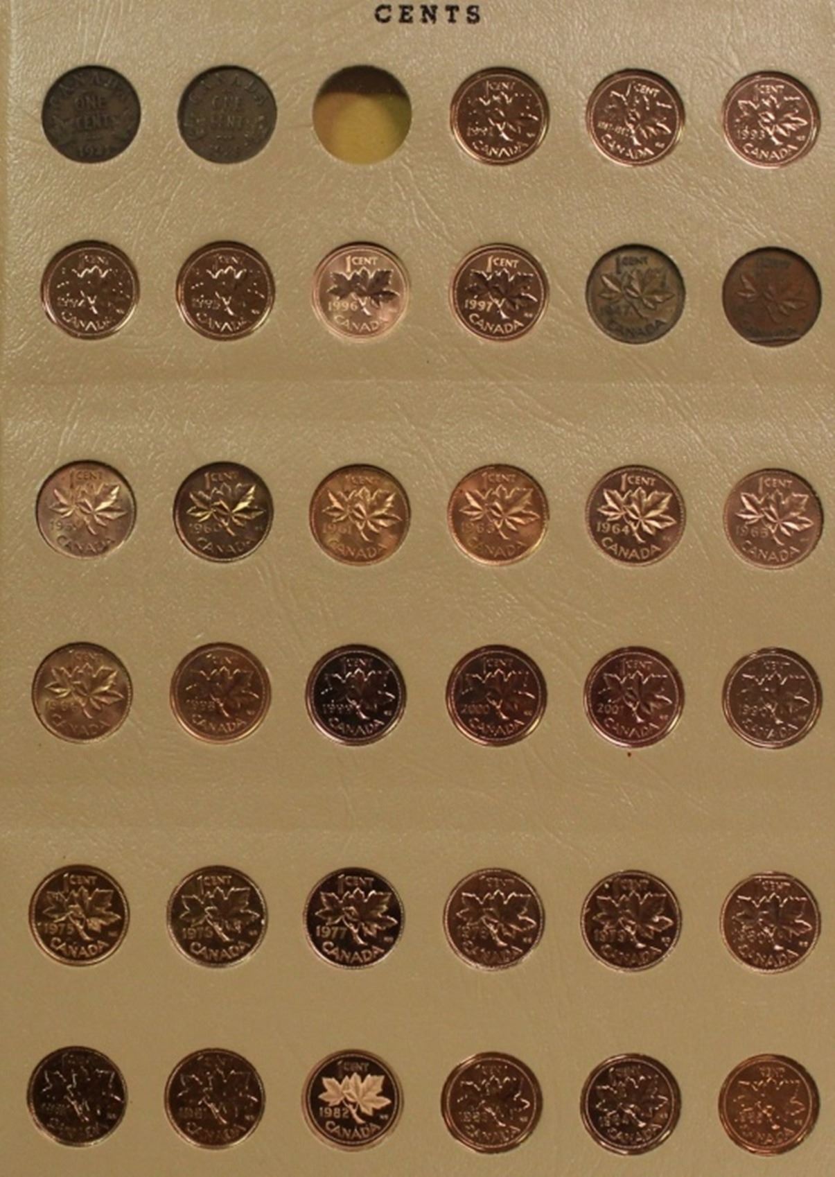 CENT SET 1920-1985 COMPLETE XF-BU; PAGE EXTRA CANADA CENT; NICKEL 1922-1988 MISSING 1925 AND 1926 FAR 6; NICKEL SET GEM BU 1951 AND UP WITH MANY EXTRAS. ESTIMATE: $500-$600