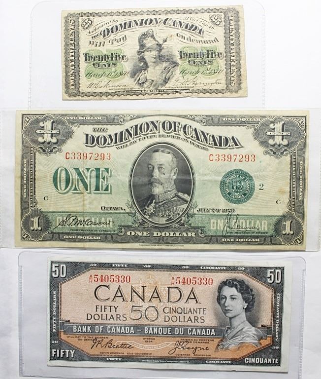 1870 TWENTY FIVE CENT SHINPLASTER PLAIN VG, 1954 FIFTY CENT "REVISED" NOTE XF, AND 1923 $1.00 NOTE F-VF. ESTIMATE: $250-$350