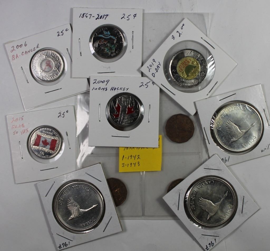 4 COLORED QUARTERS (2002, 2006, 2015 AND 2017), AND 2019 D-DAY $2.00, (4) TOMBAC NICKELS (1) 1942, (3) 1943 AND 3 PIECE 1967 CANADA SILVER DOLLARS GEM BU. ESTIMATE: $65-$100