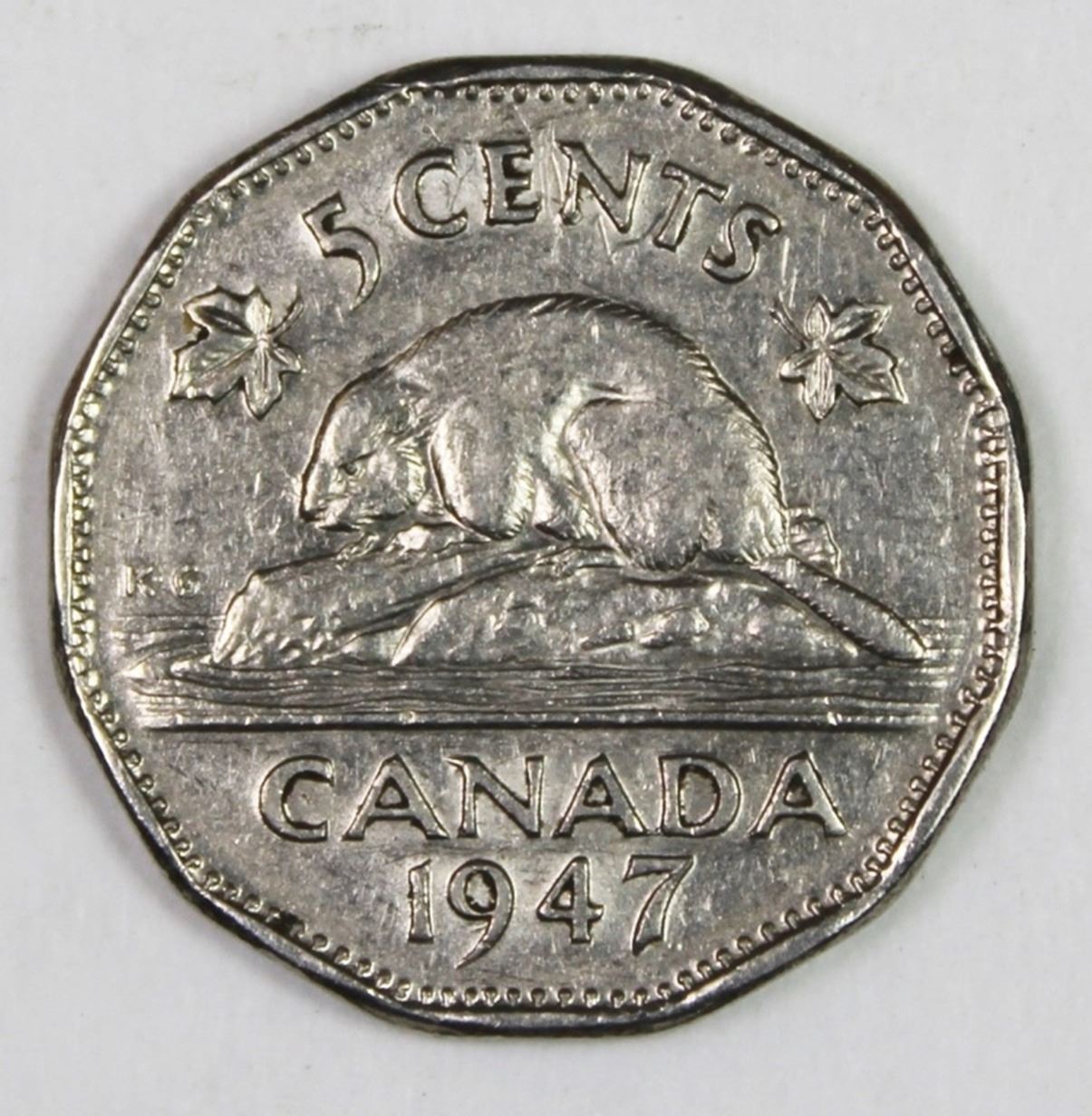 1957 CANADA NICKEL BUG ON TAIL AU AND 1947 DOT NICKEL XF-AU MARKS ON OBVERSE. ESTIMATE: $135-$200