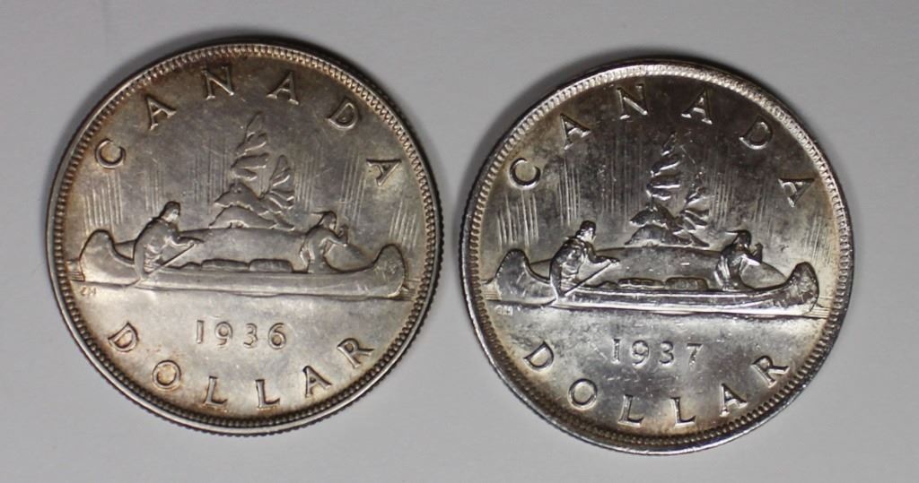 CANADIAN SILVER DOLLARS: 1936 AU & 1937 BU. ESTIMATE: $225-$275