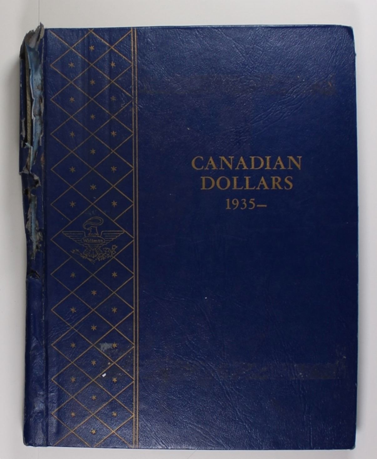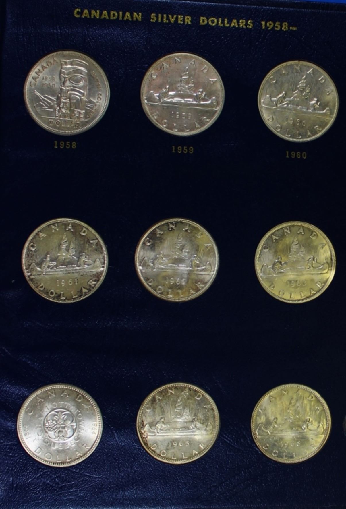 CANADIAN SILVER DOLLARS - ALL CH BU: 1958, 59, 60, 61, 62, 63, 64, 65, AND 66. 9 COINS IN OLD ALBUM. ESTIMATE: $225-$275