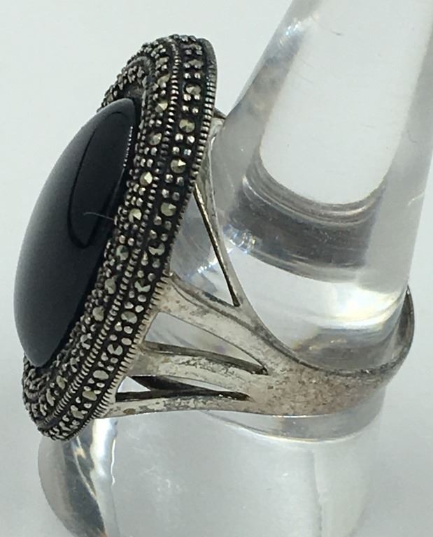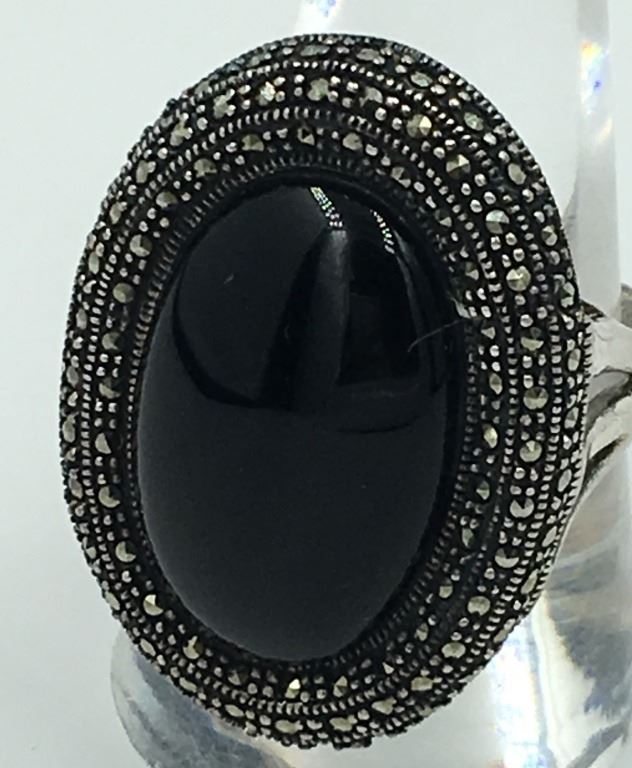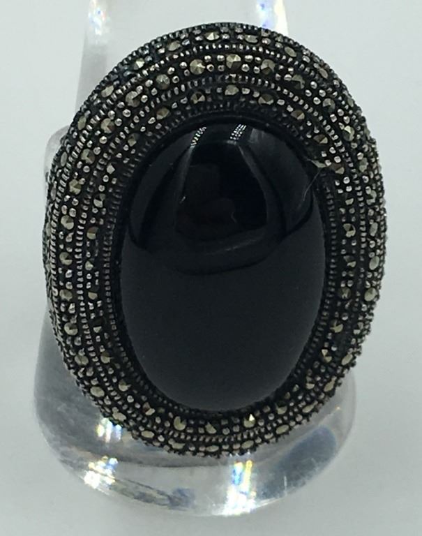 .925 STERLING MARCASITE RING WITH BLACK STONE. SIZE 9 1/2. PRE-OWNED. ESTIMATE: $75-$100