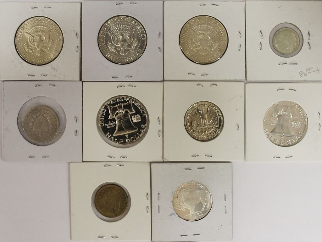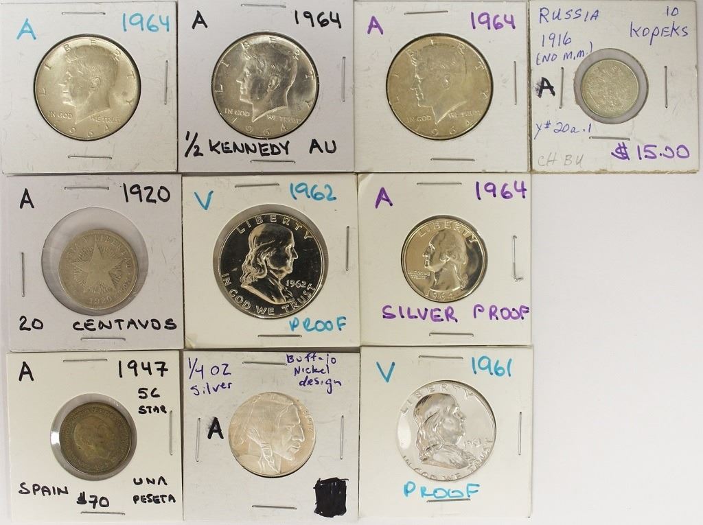 THREE 1964 SILVER HALF DOLLARS, 1961 AND 1962 PROOF HALF DOLLAR, 1/4 OZ .999 SILVER, 1964 PROOF QUARTER, 1920 20 CENTAVOS CUBA; 1916 RUSSIA 10 ROPEKS, AND A 1947 SPAIN UNA PESETA 56 STAR. RARE. ESTIMATE: $110-$150