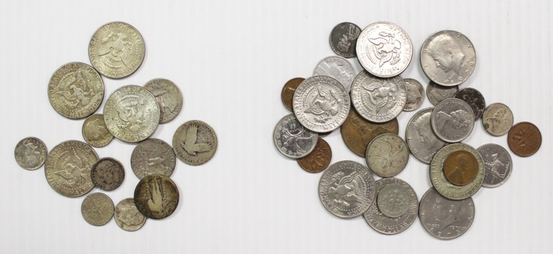 BAG OF FOREIGN COINS, WHEAT CENTS, 10 SMS 40% SILVER HALF DOLLARS, (8) KENNEDY HALF DOLLARS AND $3.50 FACE VALUE OF 90% SILVER. ESTIMATE: $65-$100