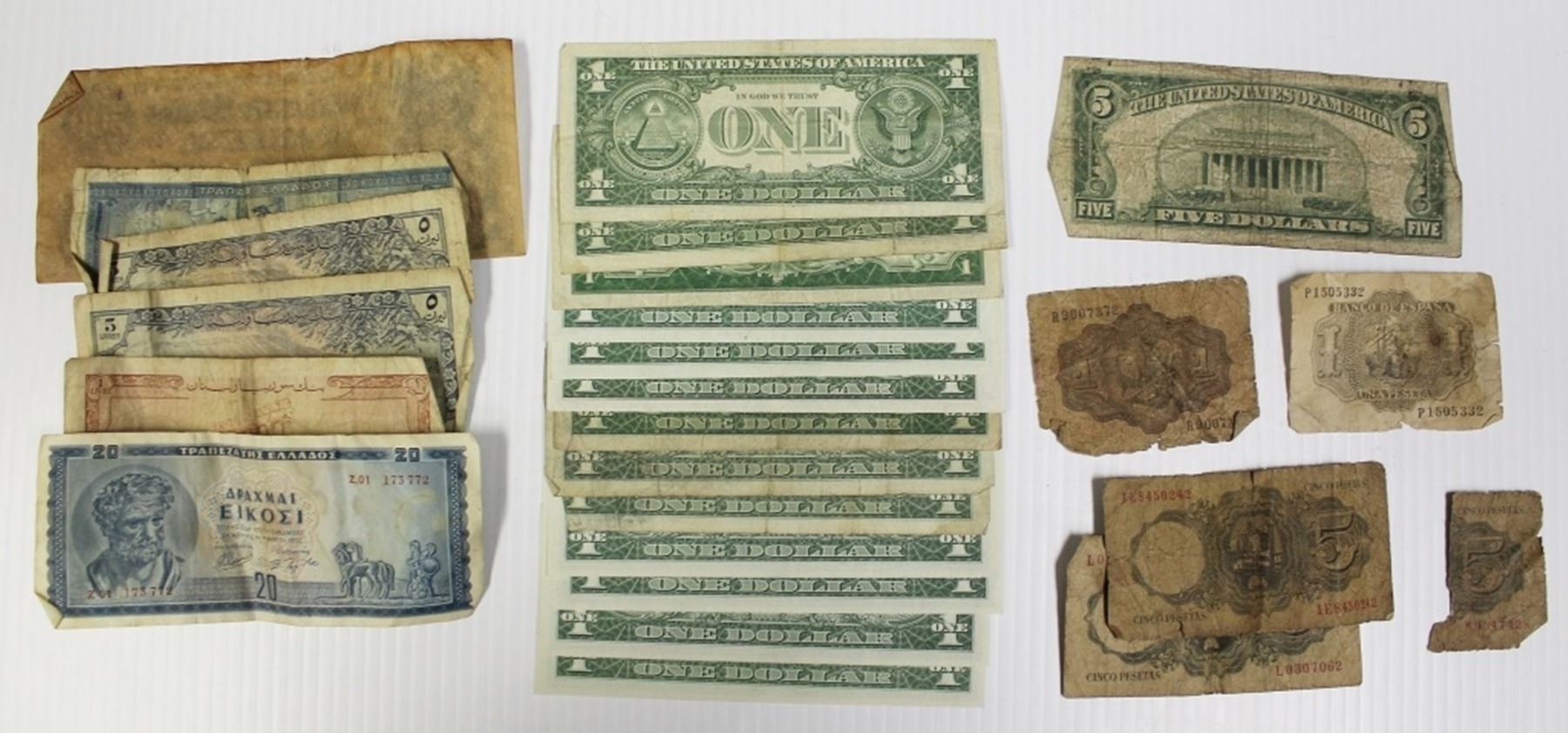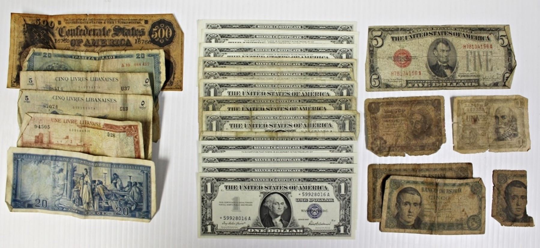 FOREIGN, REPLICA $500 WITH CONFEDERATE, (7) UNC $1.00 SILVER CERTIFICATES, 1934 $1.00 FUNNYBACK VF, SILVER CERTIFICATES, (5) $1.00 SILVER CERTIFICATES CIRC, 1928 $5.00 CIRC. ESTIMATE: $100-$150