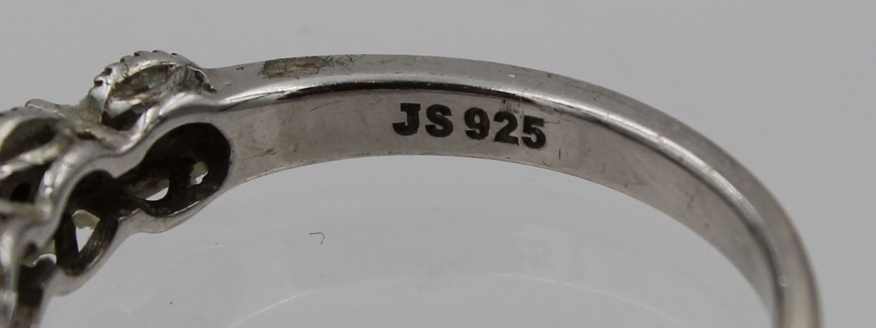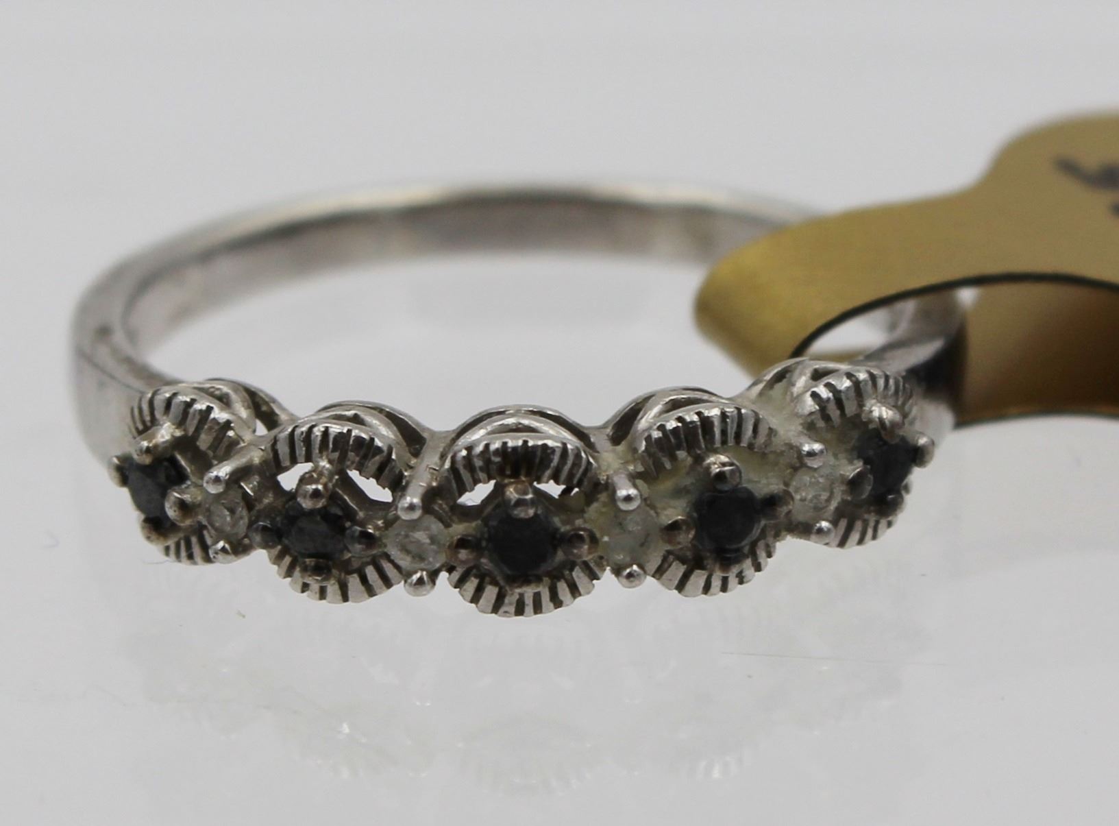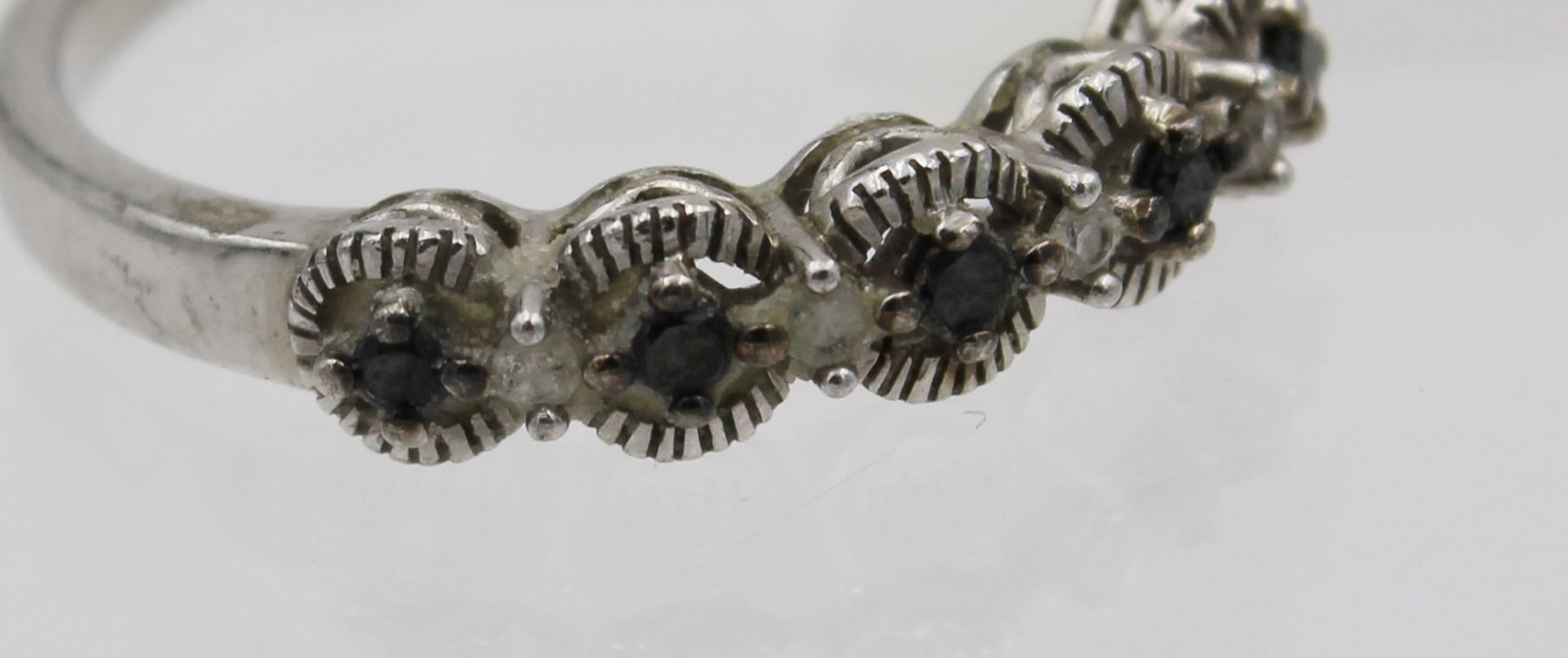 DESIGNER "JS" STACKABLE STERLING SILVER BLUE AND WHITE DIAMOND STACKABLE RING. SIZE 9.5. PRE-OWNED. 4.6 GRAMS. ESTIMATE: $75-$100