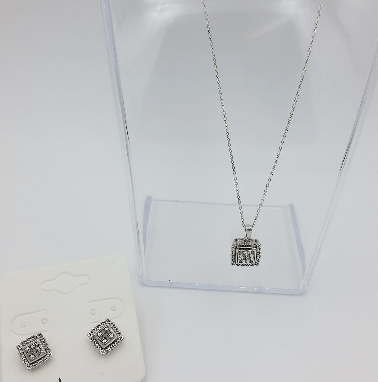 DIAMOND AND STERLING SILVER NECKLACE AND EARRINGS SET. EARRINGS ARE FOR PIERCED EARS. PENDANT ON 18.5" CHAIN. PRE-OWNED. 7.1 GRAMS TOTAL WEIGHT. ESTIMATE:$100-$125