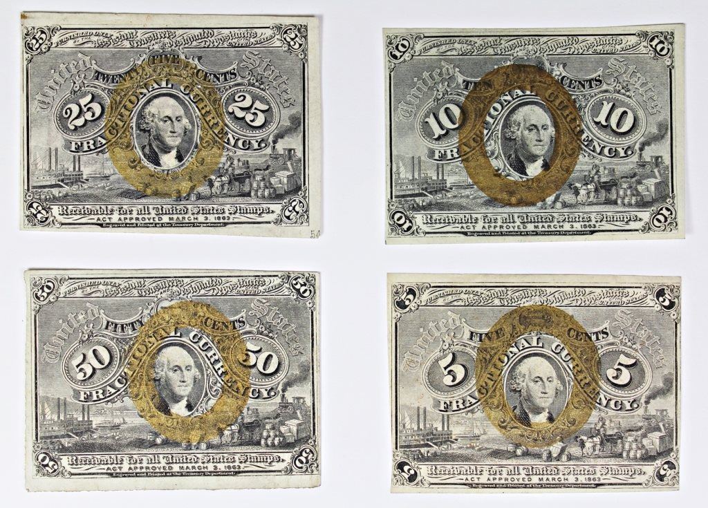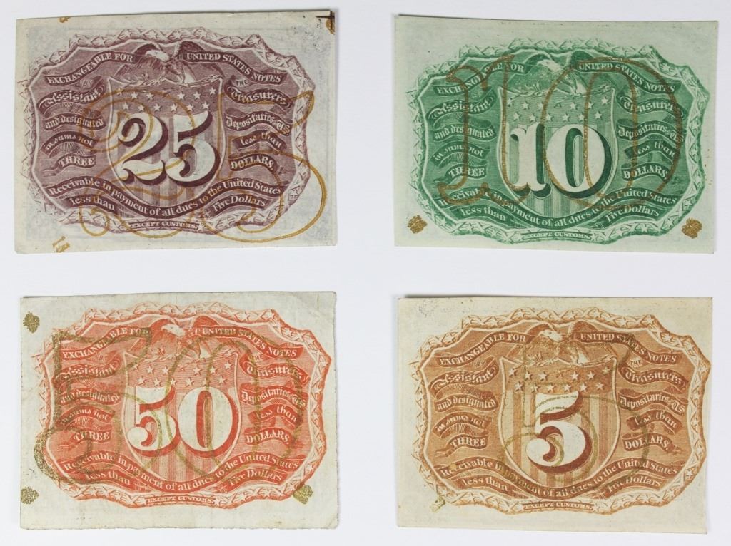 TWENTY FIVE CENT AND FIFTY CENT. OVERPRINTS. F1232, 1245, 1284 AND 1317. AU/GEM BU. ESTIMATE: $600-$700