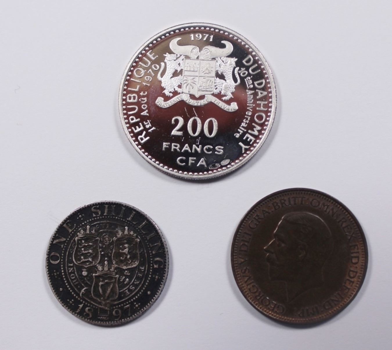 1897 SHILLING, 1936 HALF PENNY AND 1971 DAHOMEY PROOF 200 FRANCS. ESTIMATE:$110-$150