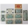 1954 CANADA ONE DOLLAR, BRASIL BANO CENTRAL DO 1, (2) MILITARY CURRENCY FIVE YEN SERIES 100, (2) MILITARY CURRENCY TEN YEN SERIES 100, ZEHNMARK M10 1944, INTERNATIONAL REPLY COUPON 13 CENTS AND 2 MARK. ESTIMATE: $150-$200