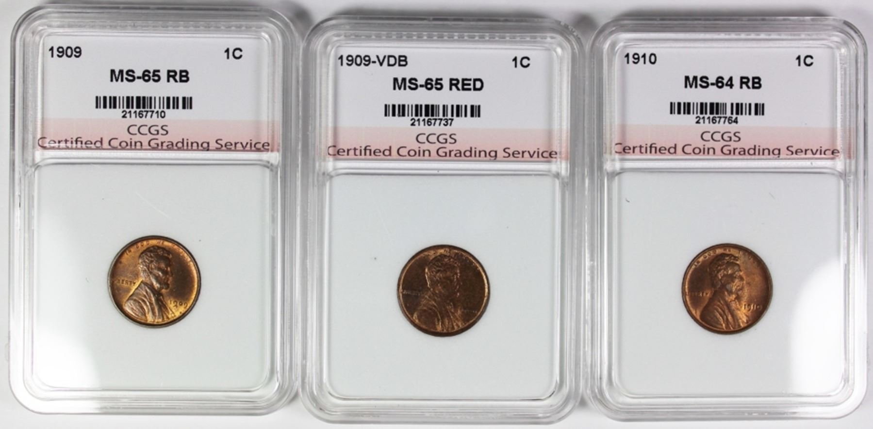 1910 GEM UNC RED, 1909 VDB GEM UNC RED AND 1909 GEM UNC RED/BROWN. ALL CCGS GRADED. ESTIMATE: $150-$250