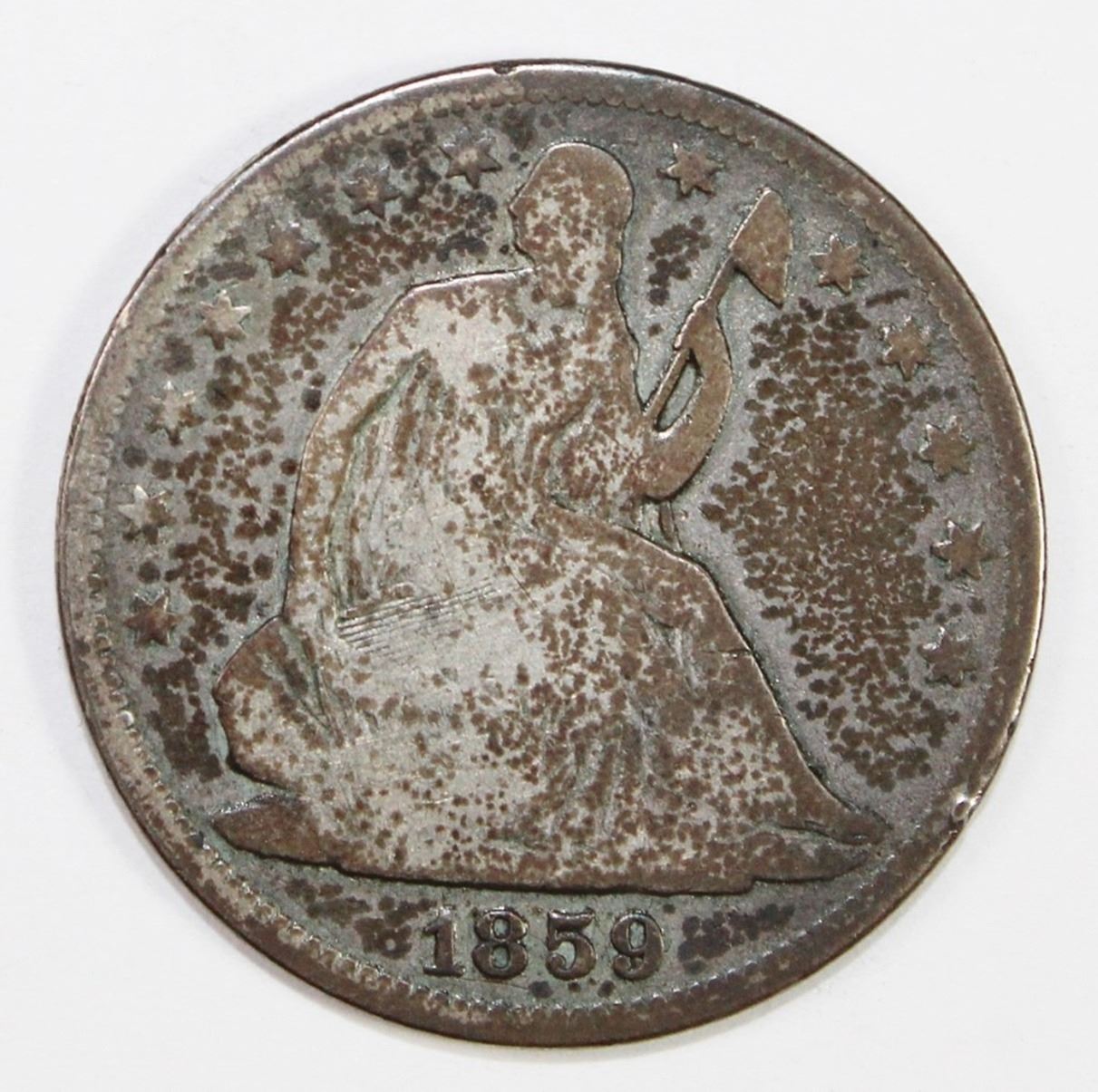 1859 SEATED HALF DOLLAR GOOD-VG, (2) SILVER $1.00 CERTIFICATES, 1976 $2.00. ESTIMATE: $75-$100
