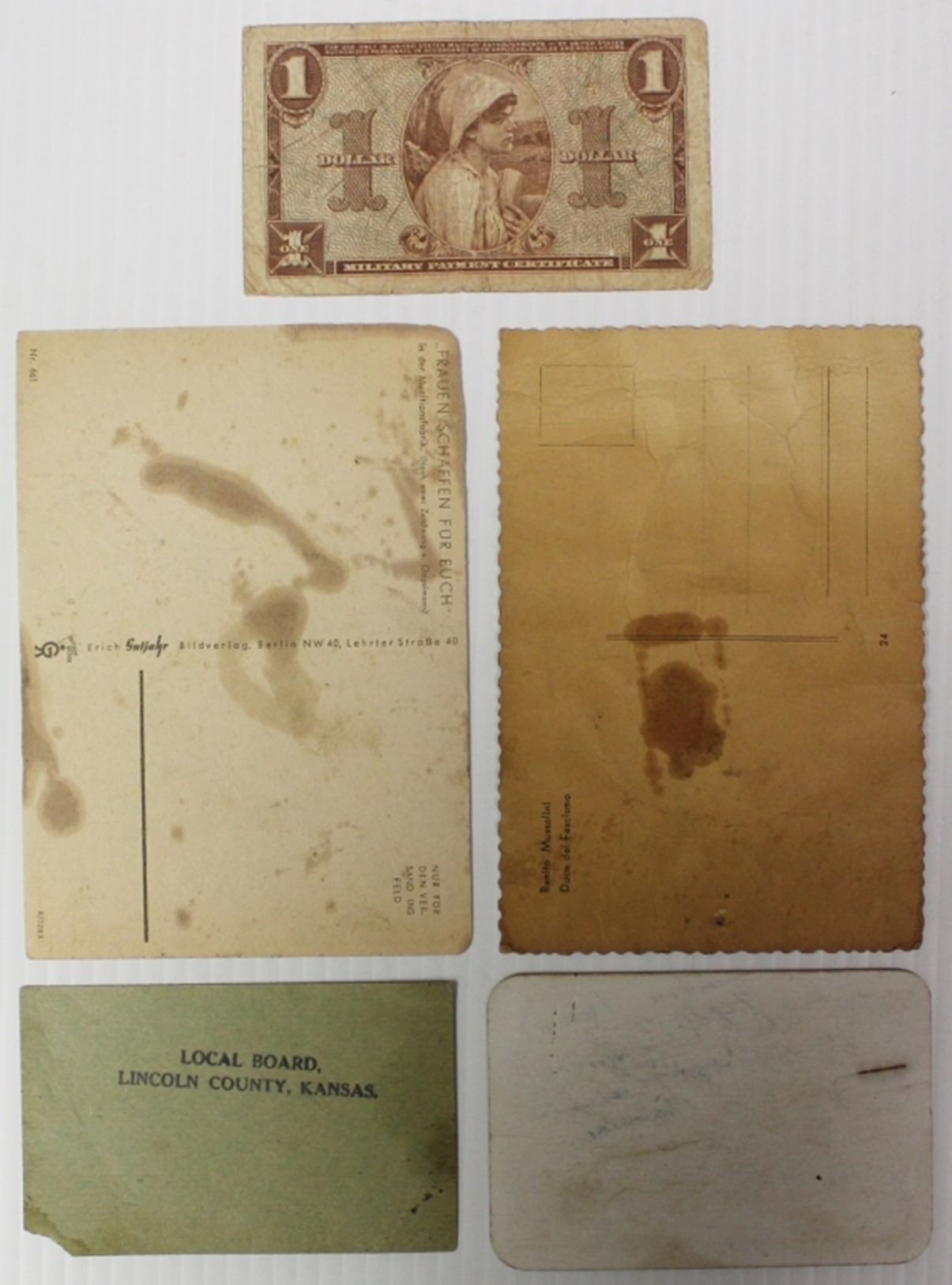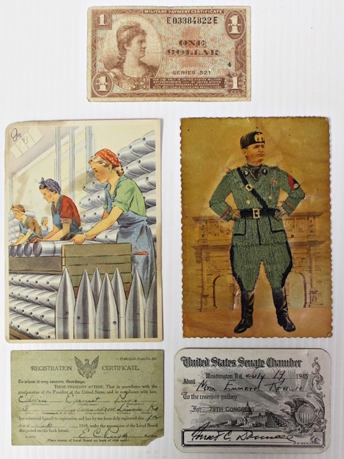 POST CARD WOMEN MAKING BOMBS, REGISTRATION CERTIFICATE 1918, UNITED STATES SENATE CHAMBER COUPON 1945, MILITARY PAYMENT ONE DOLLAR SERIES 521, BENITO MUSSOLINI POSTCARD. ESTIMATE: $100-$150