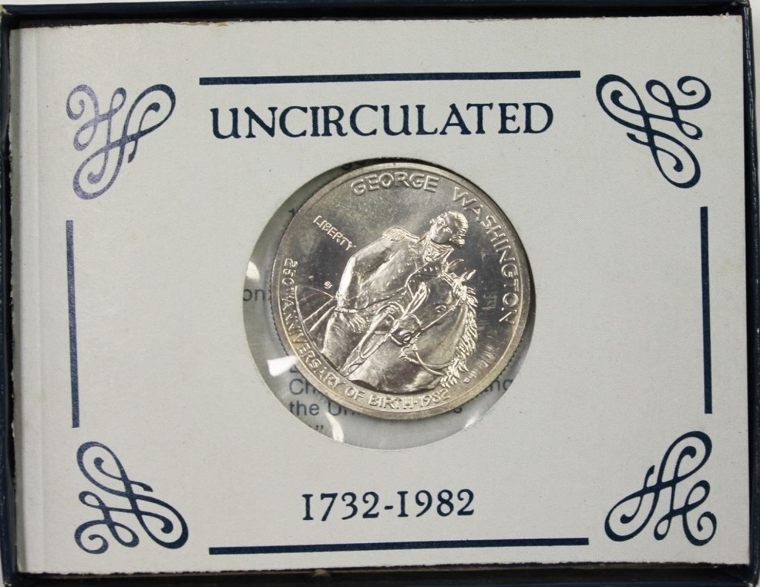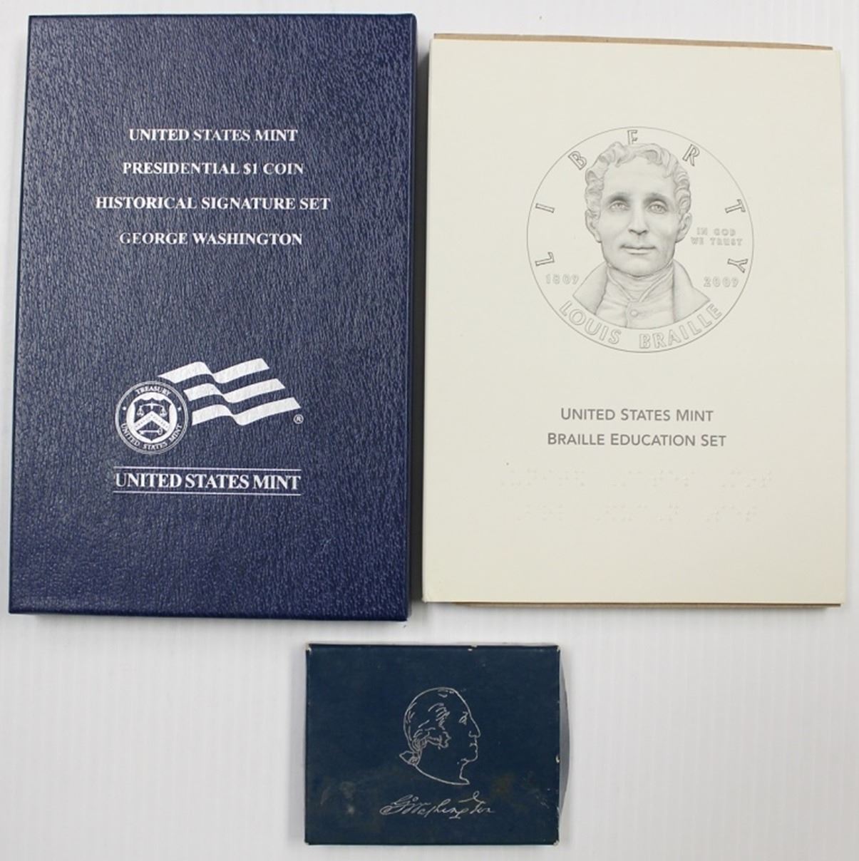 1982 GEORGE WASHINGTON SILVER HALF DOLLAR, WASHINGTON $1.00 U.S. MINT COIN SET HISTORICAL SIGNATURE, BRAILLE COMMEMORATIVE SILVER DOLLAR SET. ESTIMATE: $65-$100