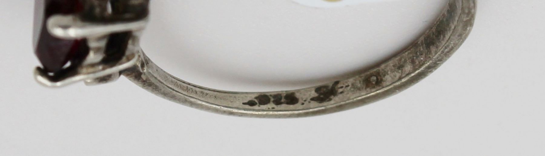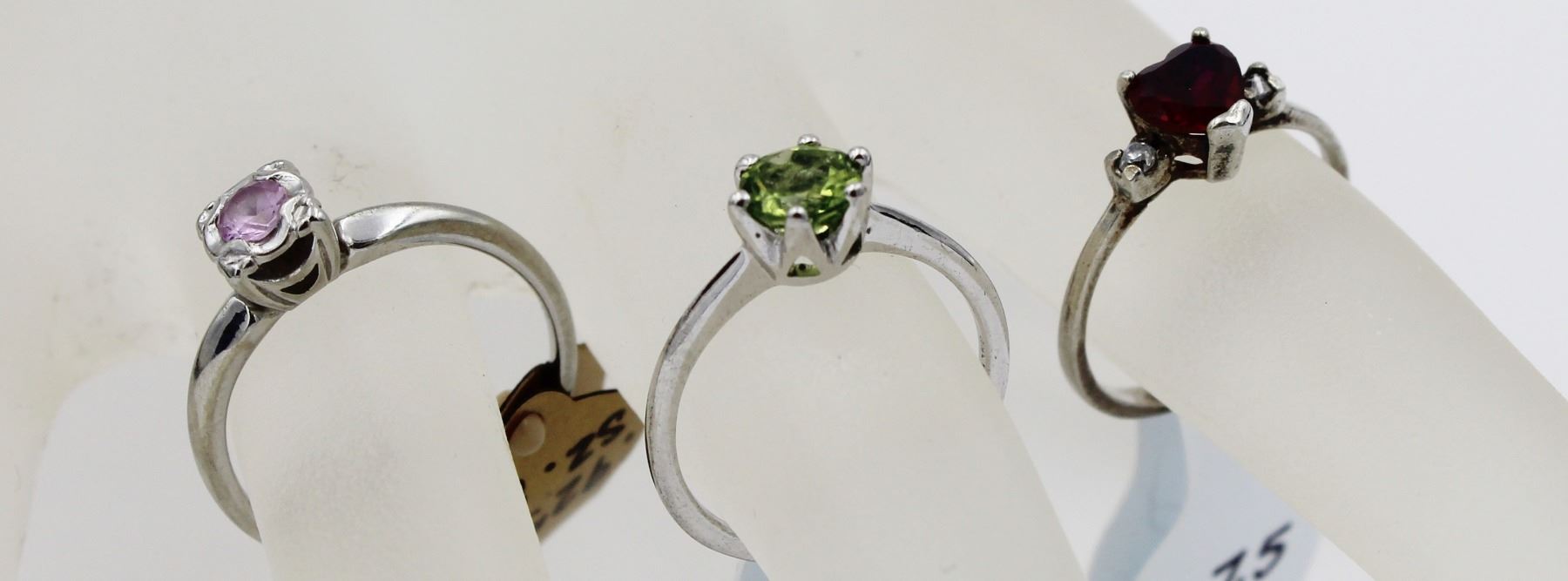 GROUP OF 3 STERLING SILVER RINGS - PERIODT SIZE 6.5, HEART=SHAPED RUBY SIZE 7.5 AND DEEP PINK STONE SIZE 8. TOTAL WEIGHT IS 6.9 GRAMS. PRE-OWNED. ESTIMATE:$80-$100