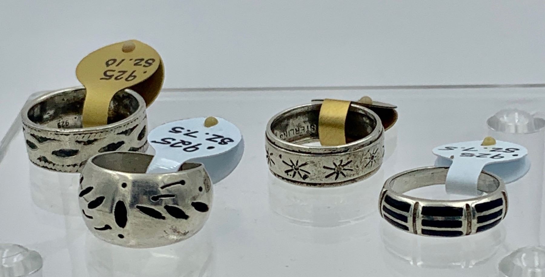 GROUP OF 4 DETAILED STERLING SILVER BANDS. VARIOUS DESIGNS. (2) SIZE 7.5, (1) SIZE 8.5 AND (1) SIZE 10. SEE PHOTOS. PRE-OWNED. 17.7 GRAMS TOTAL. ESTIMATE: $60-$80