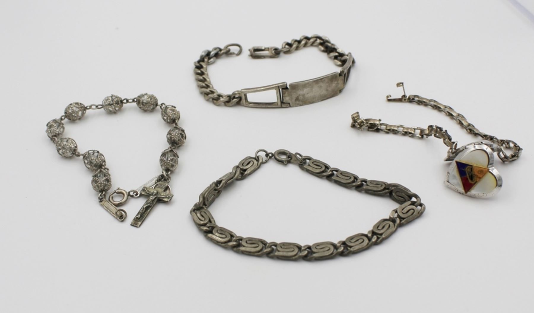 INCLUDE HEART LOCKET, ONE WITH ENGRAVABLE NAMEPLATE, BALLED CHAIN WITH CROSS AND ONE THICK CUREVED DESIGN. ALL PRE-OWNED. 49.3 GRAMS TOTAL. ESTIMATE: $50-$75