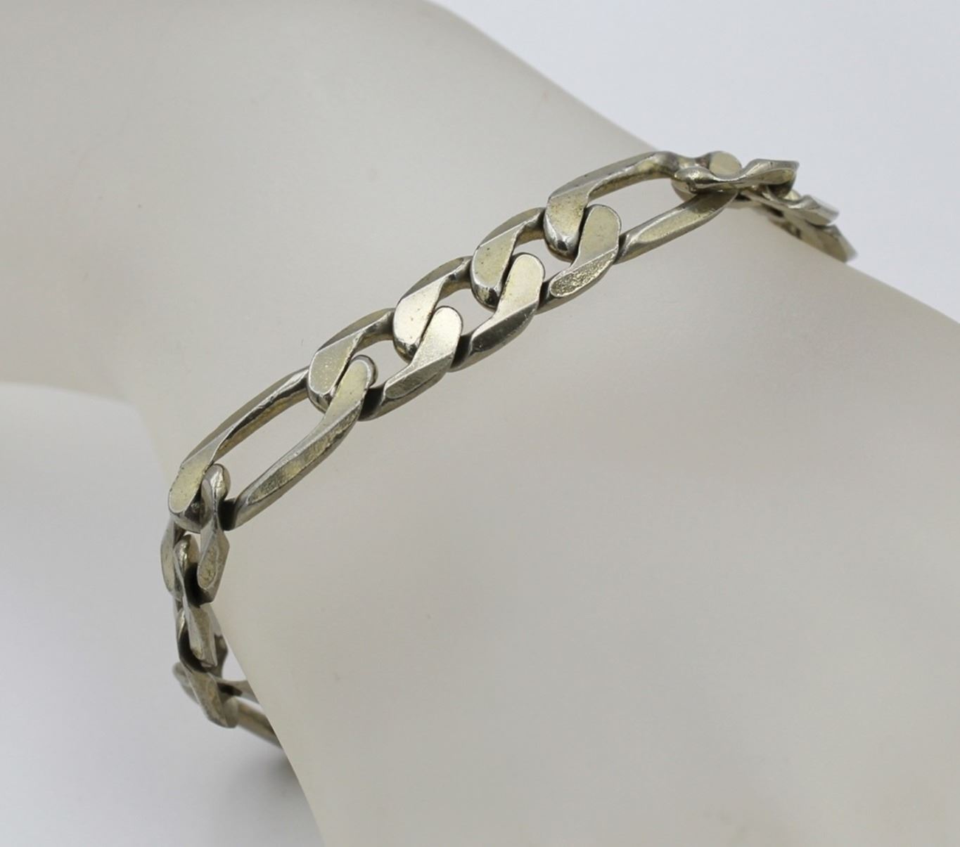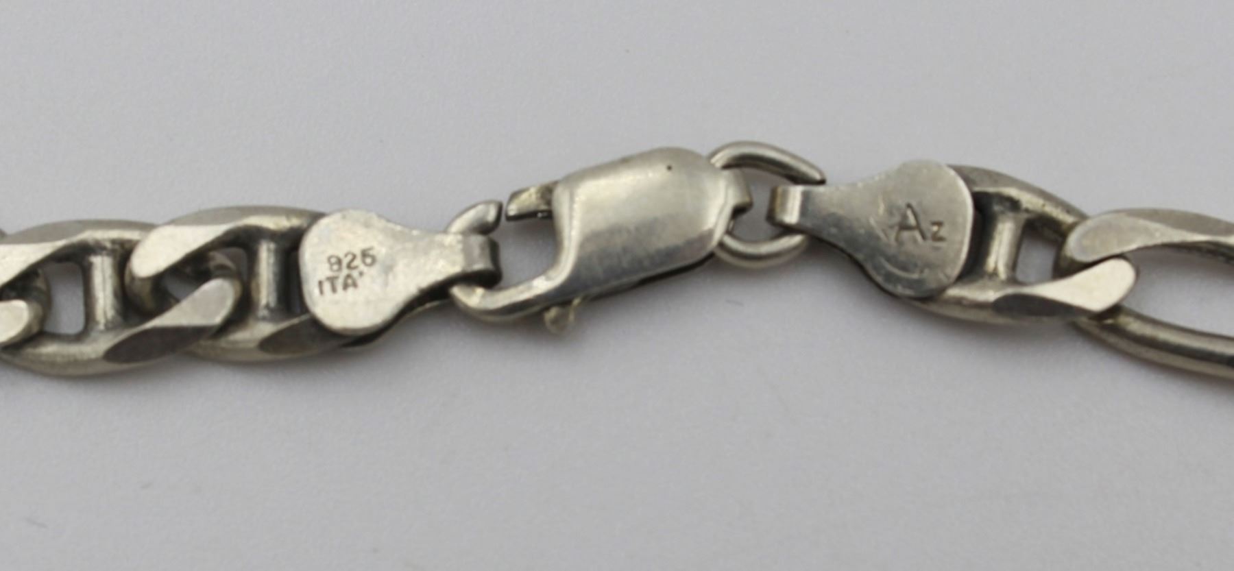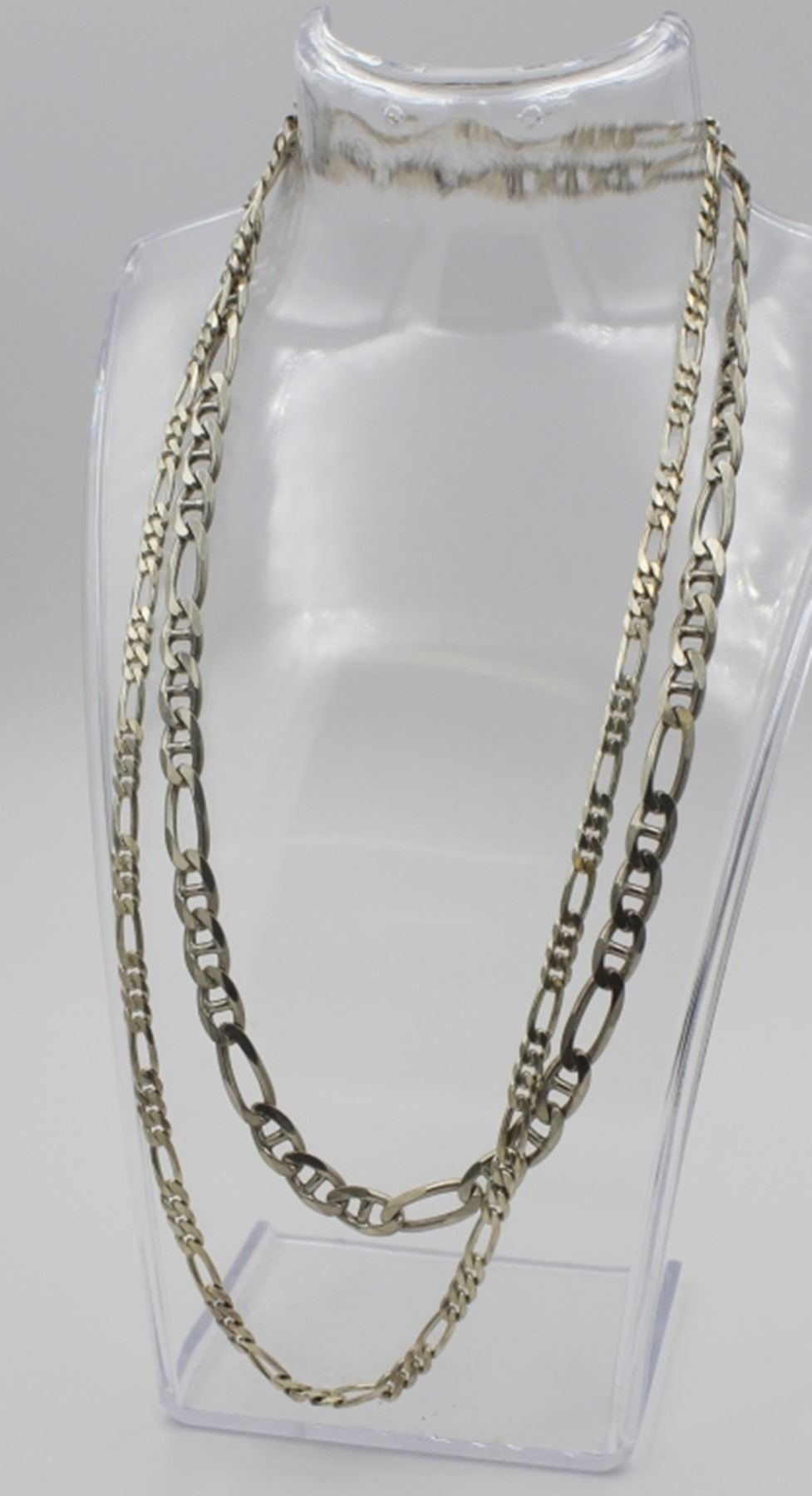 3 STERLING SILVER CHAINS, TWO NECKLACES AND ONE BRACELET. NECKLACES ARE 17" AND 19.5" LONG. BRACELET IS 8" LONG. 69.2 GRAMS TOTAL. PRE-OWNED. ESTIMATE: $60-$80