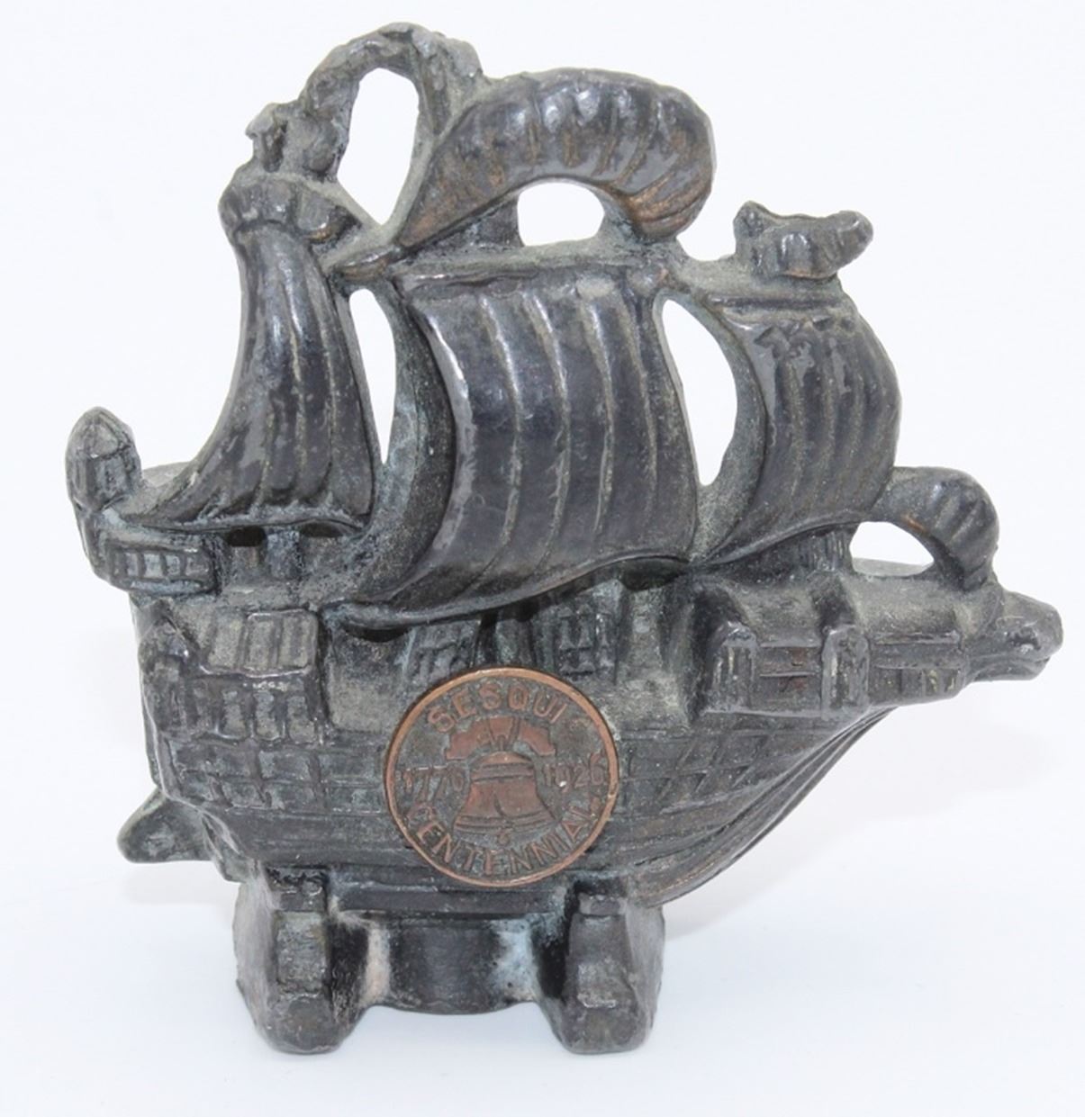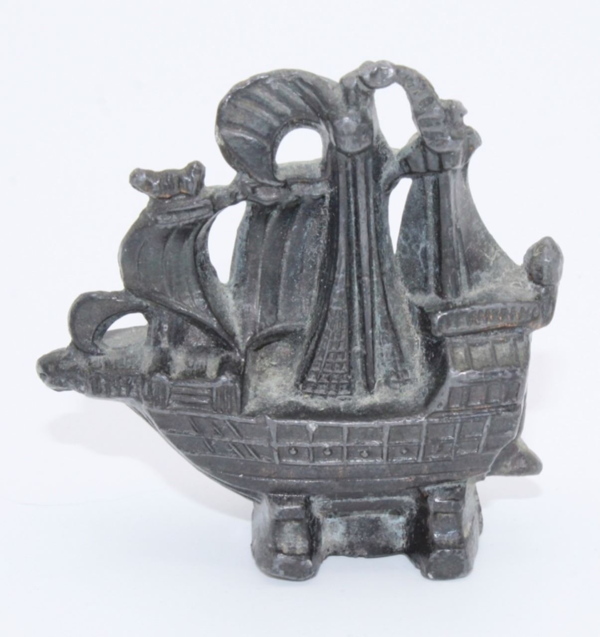 PAPERWEIGHT ABS. PERFECT. NO CHIPS. MAYFLOWER DEPICTED. JET BLACK PATINA. A GREAT ITEM WEIGHS 9.1 OZ MEASURES 2 1/2 X 2". ESTIMATE: $100-$150