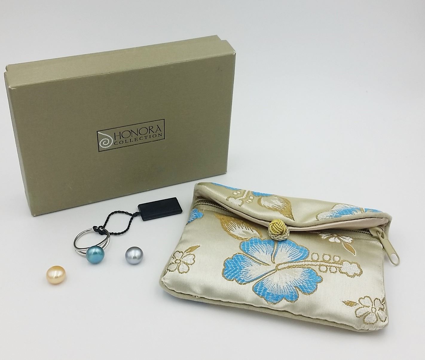 HONORA COLLECTION STERLING SILVER RING WITH INTERCHANGEABLE PEARLS THAT SCREW ON TO CHANGE UP YOUR LOOK. COMES WITH BLUE, PINK, AND SILVER. SIZE 9.5. ESTIMATE:$100-$150