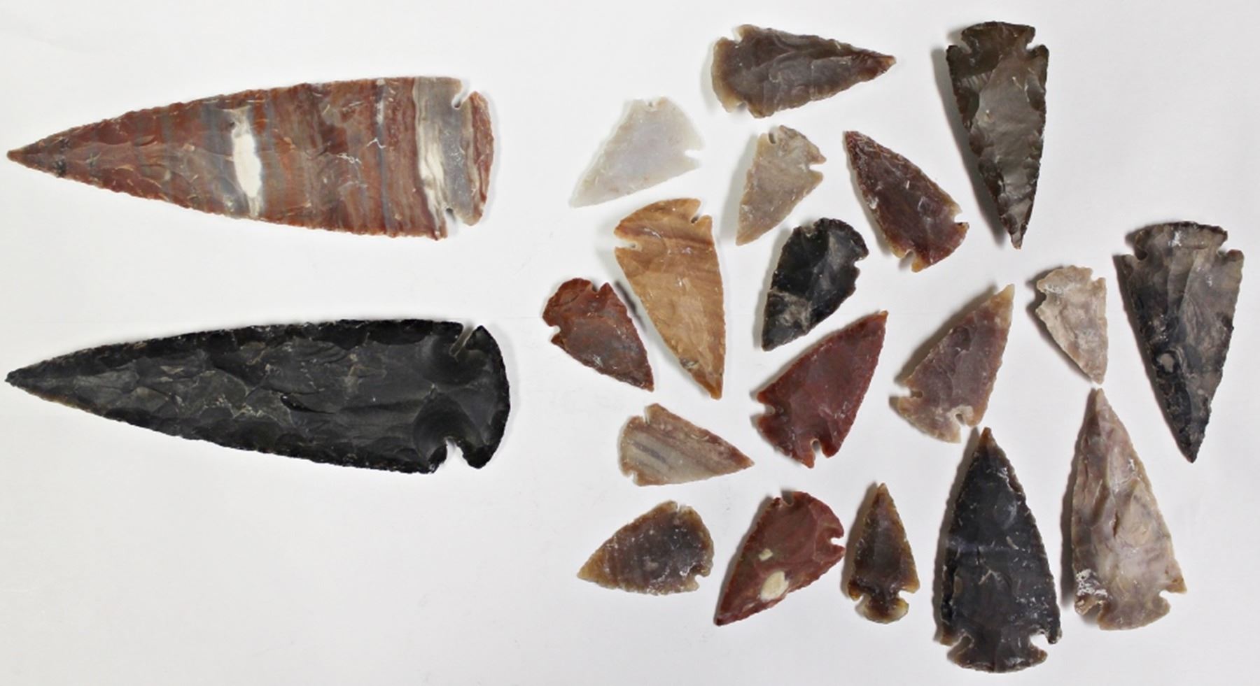 18 PIECES NICE ARROWNHEADS AND TWO NICE SPEAR HEADS, EACH 4 1/2" LONG. ESTIMATE: $250-$350