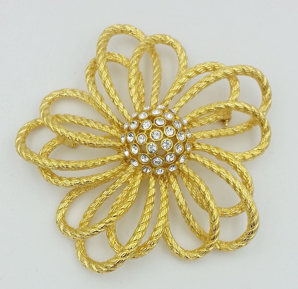 JOAN RIVERS CLASSIC COLLECTION GOLD TONED BROOCH/PIN WITH CZ'A. 2 3/4 IN DIAMETER. BOX AND POUCH INCLUDED. PRE-OWNED. ESTIMATE:$100-$150