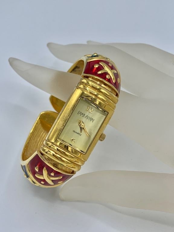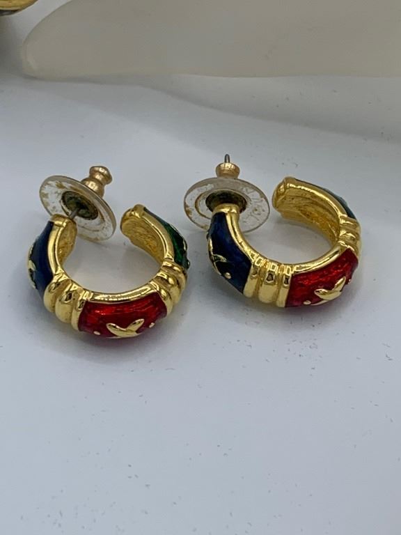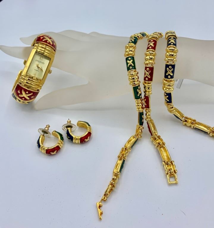 ENAMEL CUFF BRACELET WATCH, ENAMEL PIERCED EARRINGS. 3 ENAMEL BRACELETS-GREEN, RED, AND BLUE. ALL WILL FIT AN 8" WRIST, PREOWNED. ESTIMATE:$150-$200