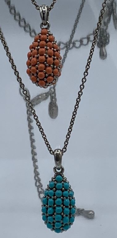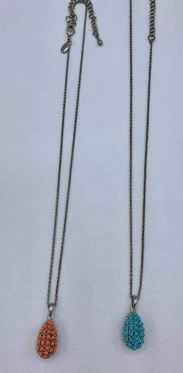 TWO ADJUSTABLE NECKLACES WITH MATCHING PIERCED EARRINGS. TURQOUISE AND CORAL. PRE-OWNED. ESTIMATE:$75-$100
