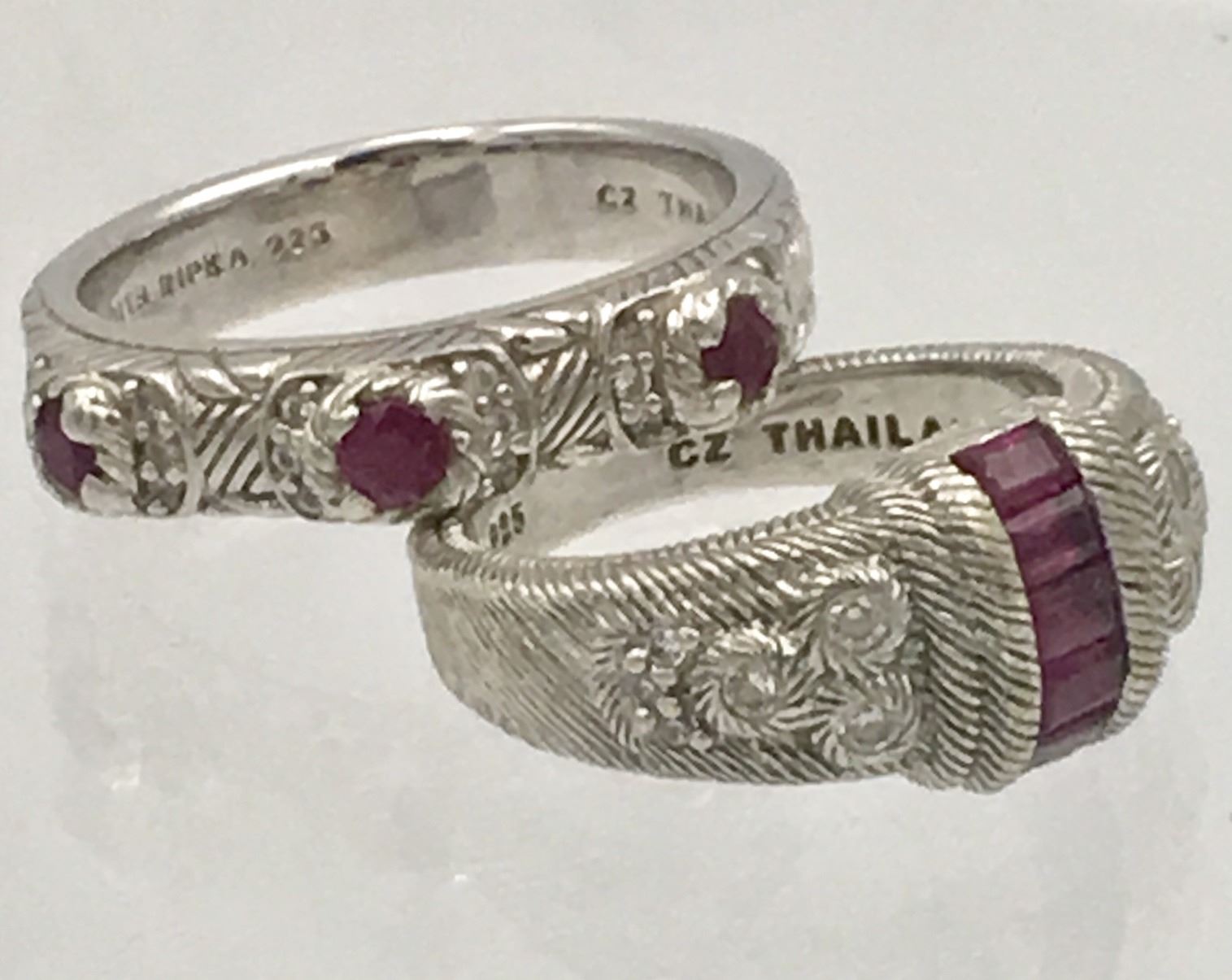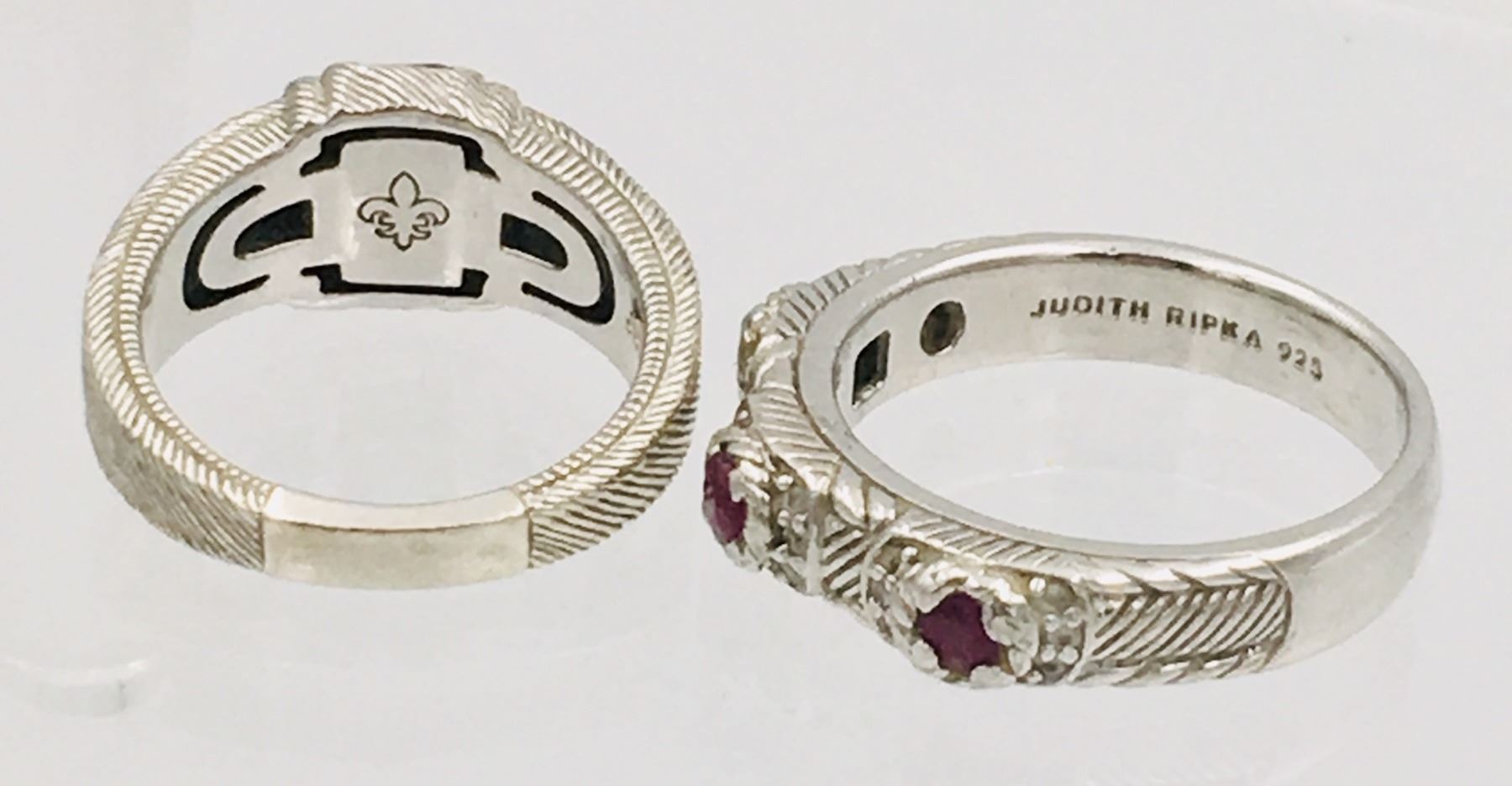 JUDITH RIPKA STERLING SILVER RINGS. ONE SIZE 7 WITH RED STONES AND A SIZE 10 WITH 3 ROUND RED STONES. PRE-OWNED. ESTIMATE:$150-$200