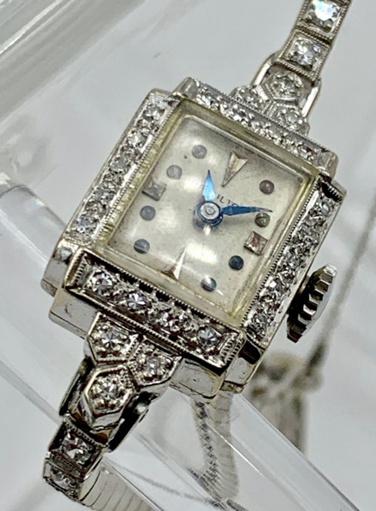 WATCH, FACE IS SURROUNDED BY 24 DIAMONDS AND THE WATCH BAND CONTAINS 36 DIAMONDS FOR A TOTAL OF 60 DIAMONDS FOR AN ESTIMATED 1.85 TDW. MOVEMENT SERIAL # 773122A WHICH DATES THIS WATCH 1907-1910. 17 JEWELS, SAFETY CHAIN. EXCELLENT VINTAGE CONDITION, LIGHT SCRATCH ON BACK OF CASE THAT CAN BE EASILY BUFFED OUT. ORIGINAL FACE IN EXCELLENT CONDITION. HAND IS ALSO 14K. ESTIMATED RETAIL VALUE $3000-$3500.