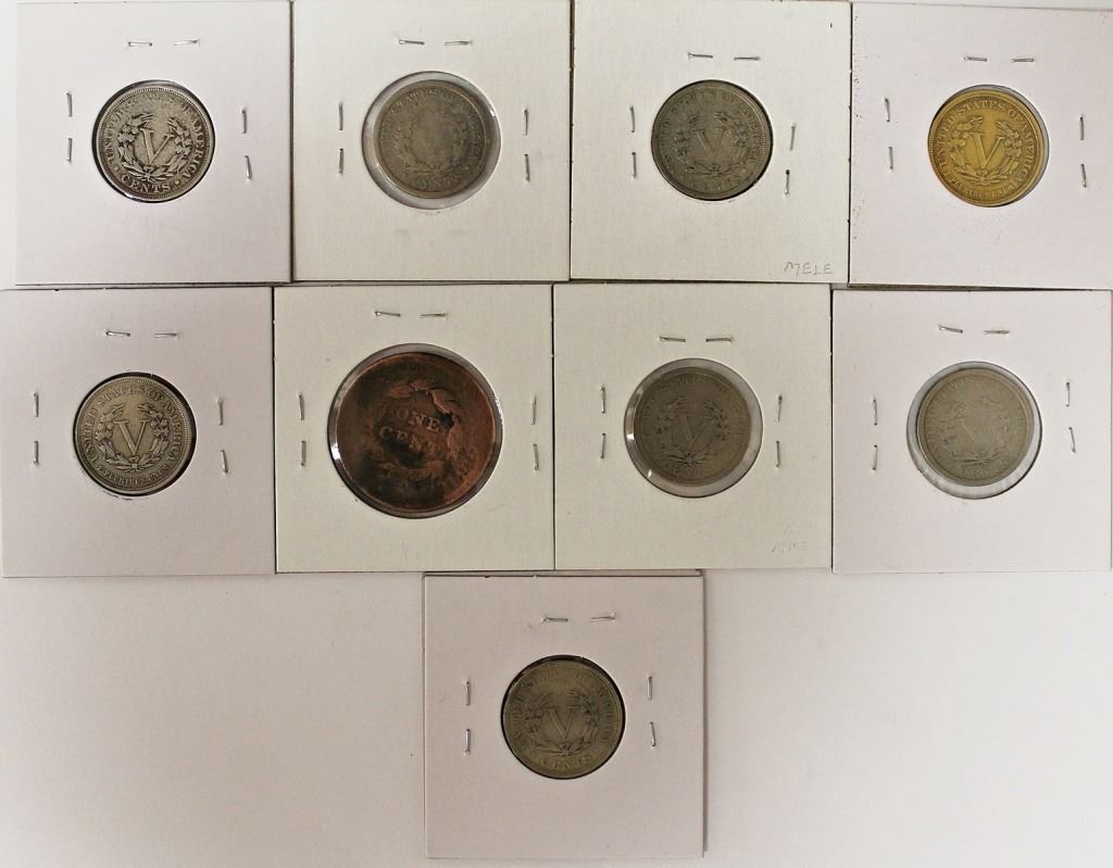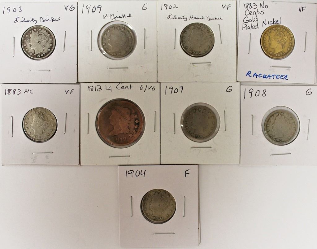 1902 VF, 1903 VG, 1904 F, 1907 G, 1908 G, 1909 G, 1883 NO CENTS VF, 1883 NO CENTS GOLD PLATED RACKATEER VF. AND 1812 LARGE CENT AG. 9 COINS TOTAL. ESTIMATE:$95-$125