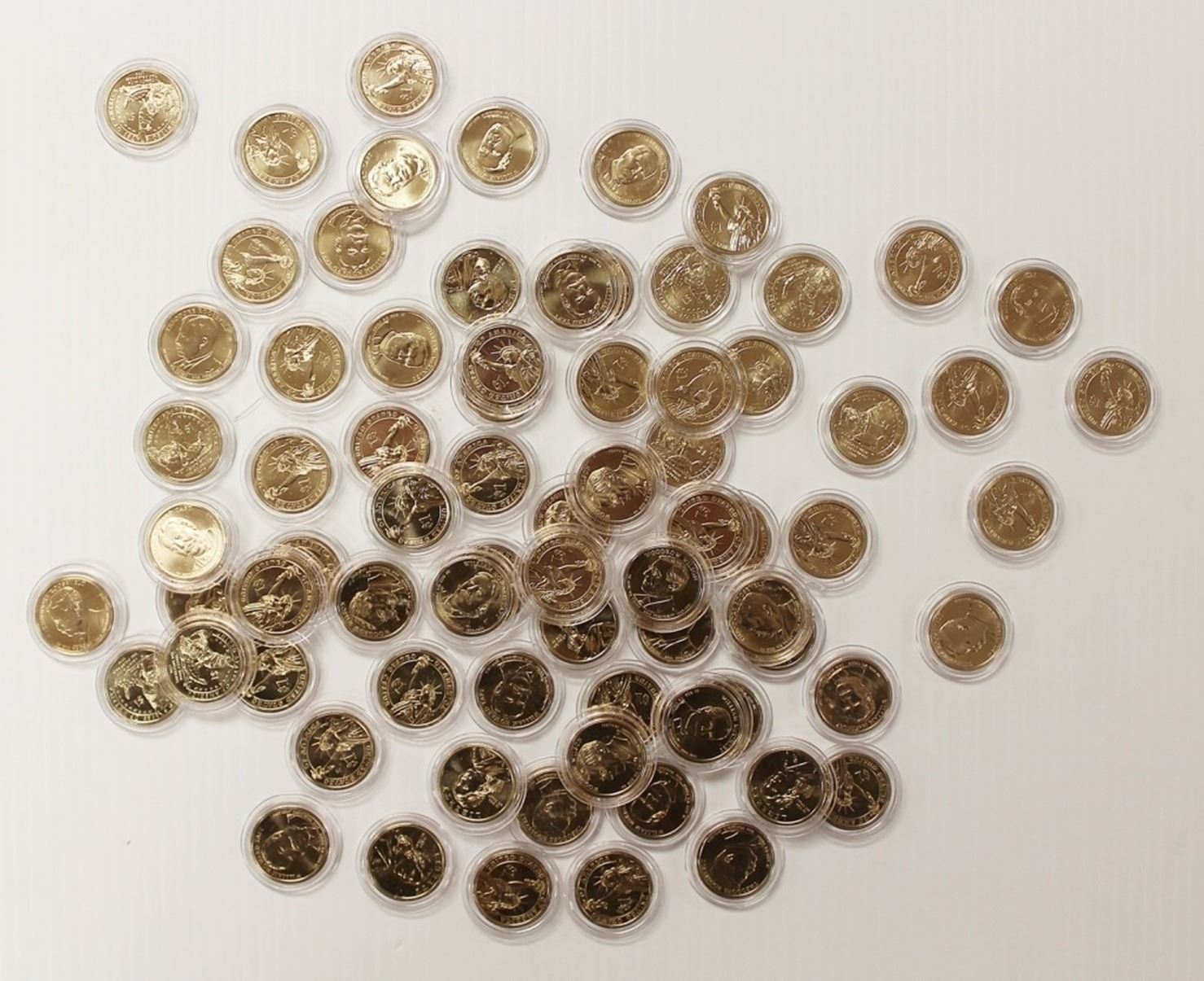 IN ORIGINAL CAPS. MCKINLEY, ROOS, TAFT, NAT, AMERICAN. ALL 2013 DATED. WOULD MAKE GREAT POKER CHIPS. ESTIMATE: $230-$300