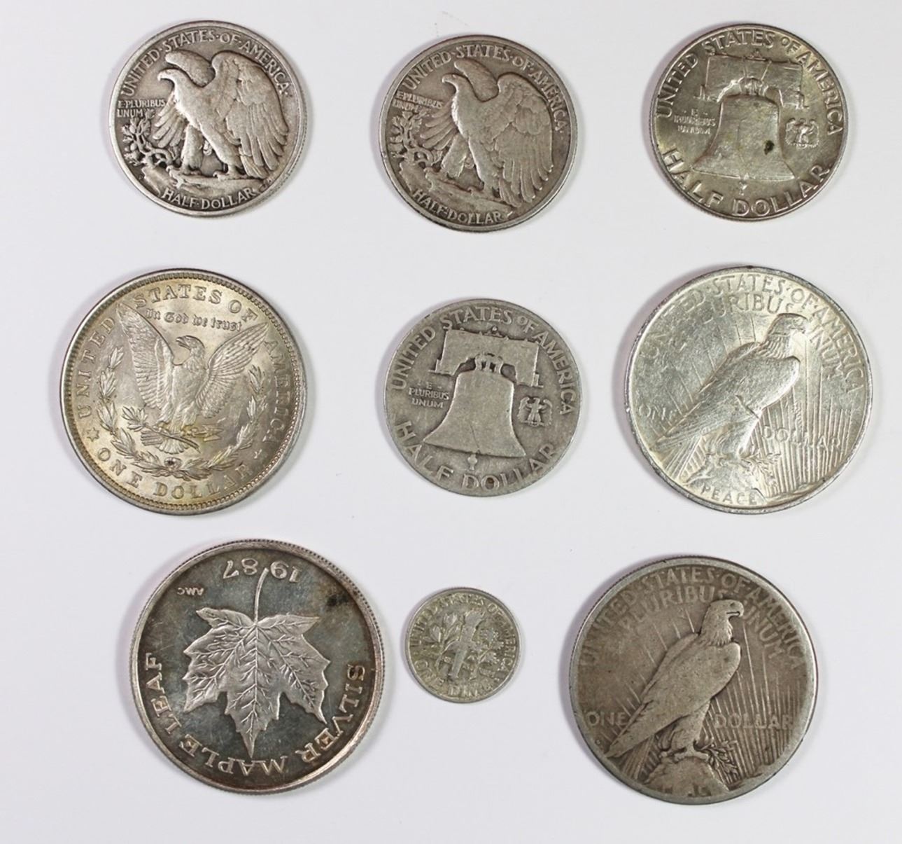 1987 .999 1 OZ. SILVER MAPLE LEAF BU CANADA; 1921 MORGAN SILVER DOLLAR AU; TWO PEACE DOLLARS 1924-S AND 1922 CIRCS; 1960 SILVER DIME; SILVER HALF DOLLARS 1941, 1963-D, 1947-D, AND 1951-D. ESTIMATE: $125-$150
