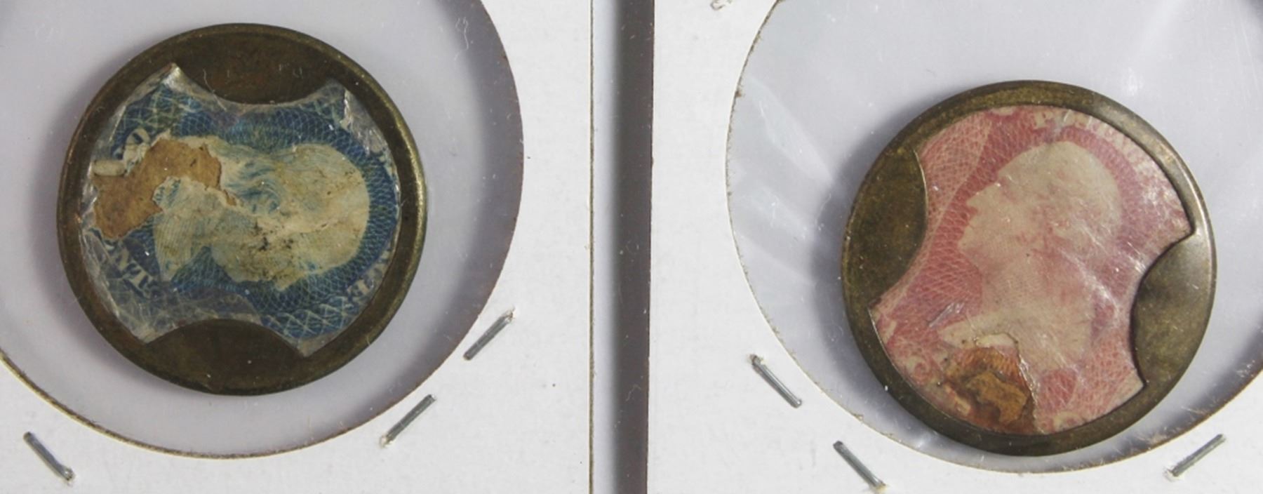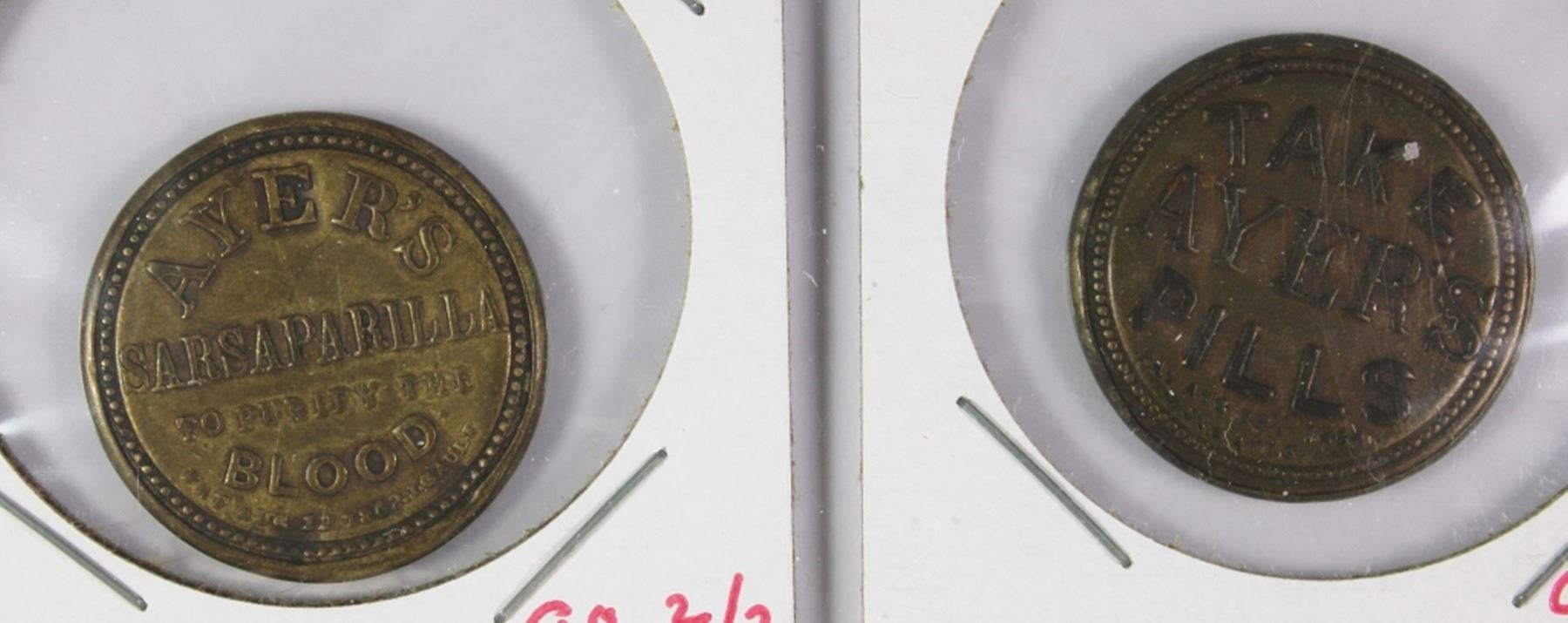 AYERS SARSAPARILLA THREE CENTS RED, SOME LIGHT BENDS TAKE AYERS PILLS ONCE CENT BLUE RATTY STAMP. A HIGHLY COLLECTIBLE PAIR. ESTIMATE: $450-$550