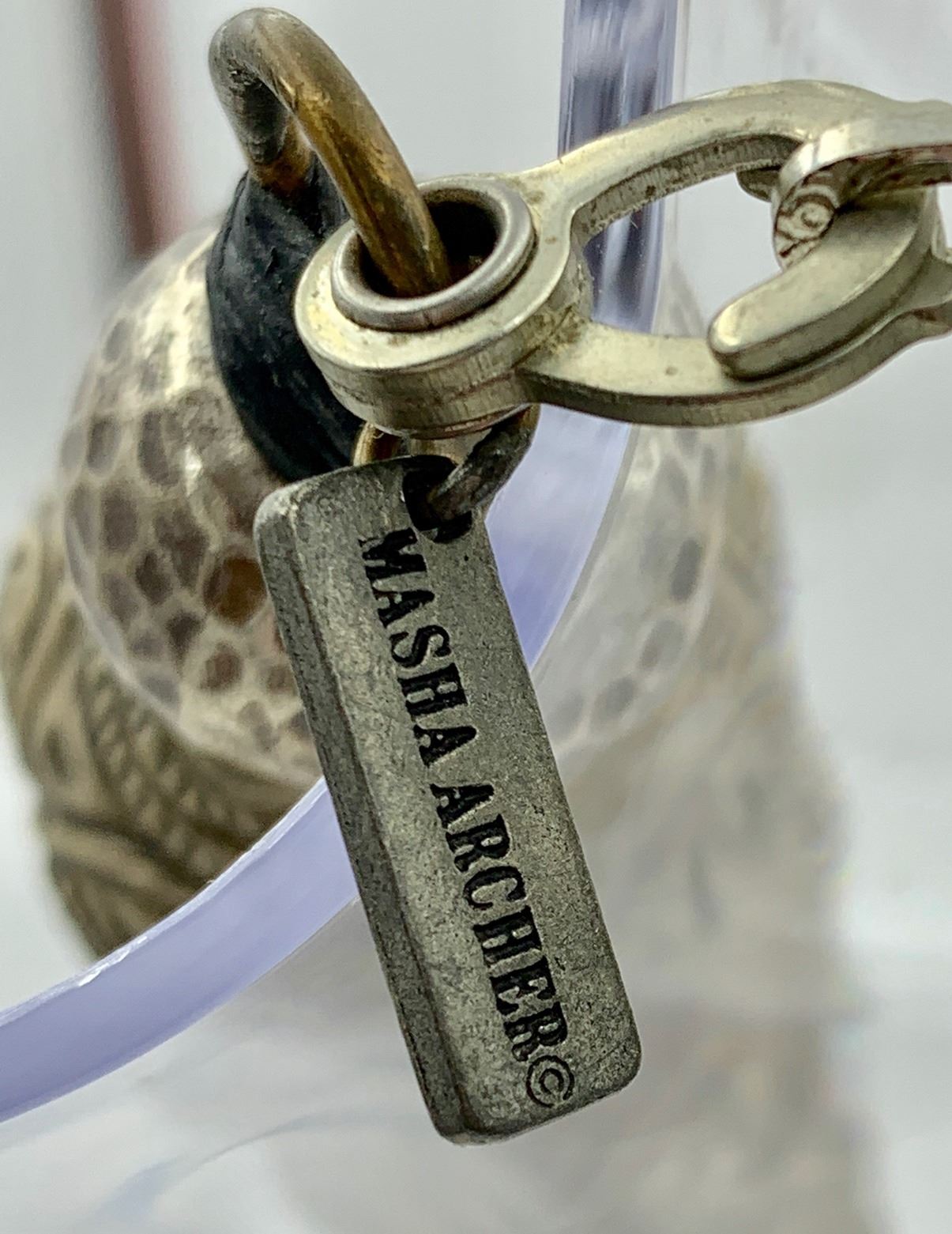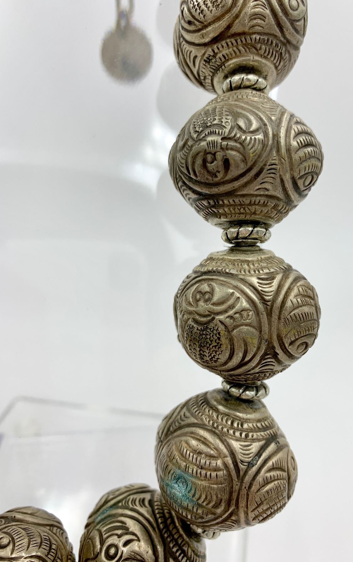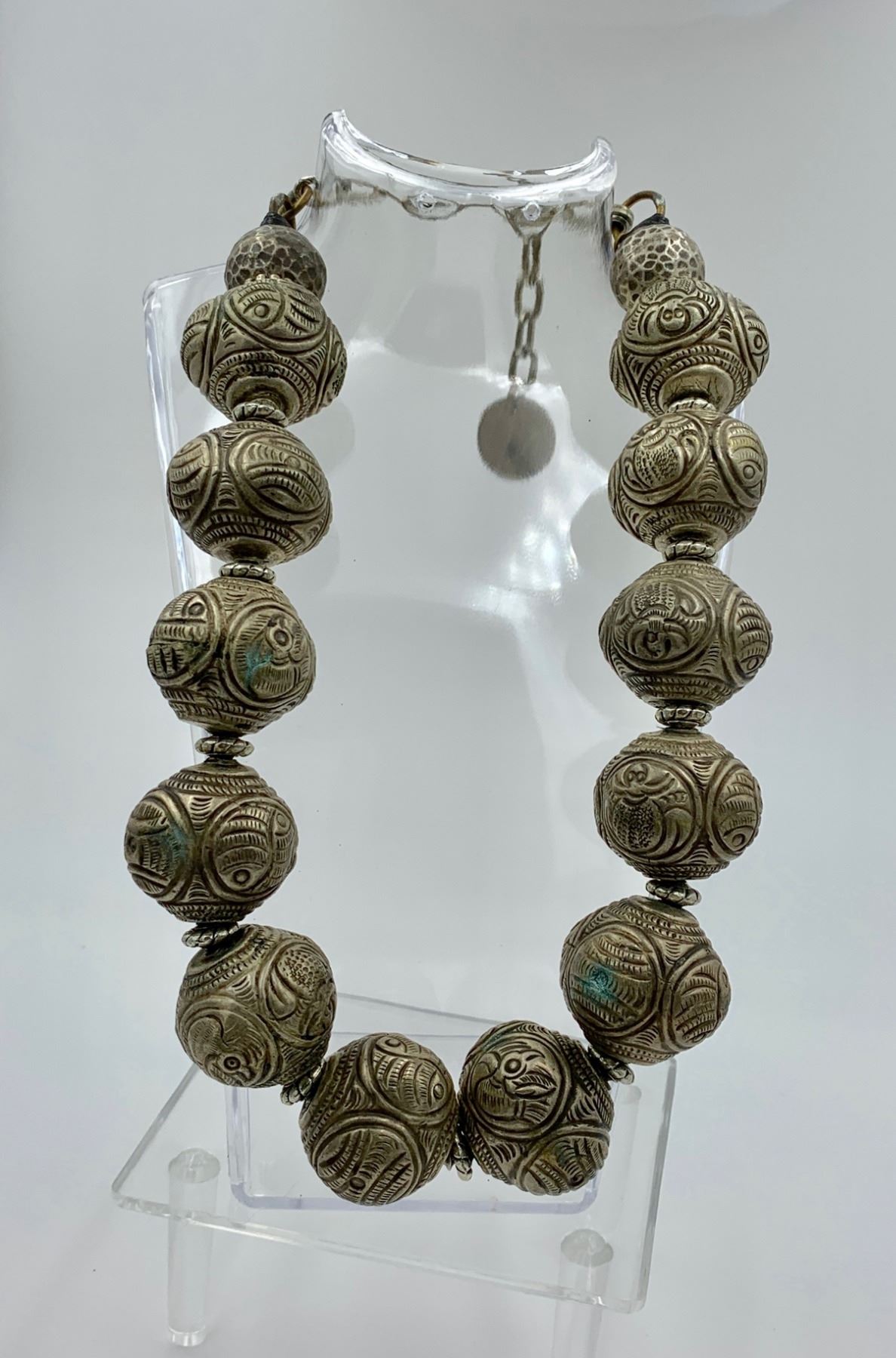 MASHA ARCHER SINGLE-STRAND NECKLACE OF WHITE BRASS/ SILVER ALLOY RONDELLES & ROUNDS, CARVED WITH DEPICTIONS OF BIRDS, FISH, AND TRADIONAL FLOR MOTIFS FROM THE HUNAN TRIBES PEOPLE OF CHINA WHO STILL PRODUCE DECORATIVE WEAR FOR BOTH PERSONAL USE AND FOR THE MARKET PLACE. 22" LONG, CONTAINS 2004 CHINESE COIN AT CLASP. MADE IN SAN FRANCISCO. VERY COLLECTIBLE! RETAILED FOR OVER $2,000. MASHA ARCHER IS A HIGHLY REGARDED INTERNATIONAL ARTIST WITH HER DESIGNS IN MANY MUSEUM AND GALLERY SHOWS. SHE DESIGNED STATEMENT JEWELRY FOR "SEX IN THE CITY". HER CLIENT LIST INCLUDES BEYONCE KNOWLES, BARBARA WALTERS, JENNIFER LOVE HEWITT, OPRAH WINFREY, JOAN COLLINS, MILEY CYRUS AND LAURA BUSH. MASHA ARCHER DESIGNS HAVE BEEN FEATURED IN PUBLICATIONS INCLUDING "OCEAN DRIVE", "VOGUE ITALIA", "ELLE", "HARPER'S BAZAAR" AND "MARIE CLAIRE". ESTIMATE: $800-$900