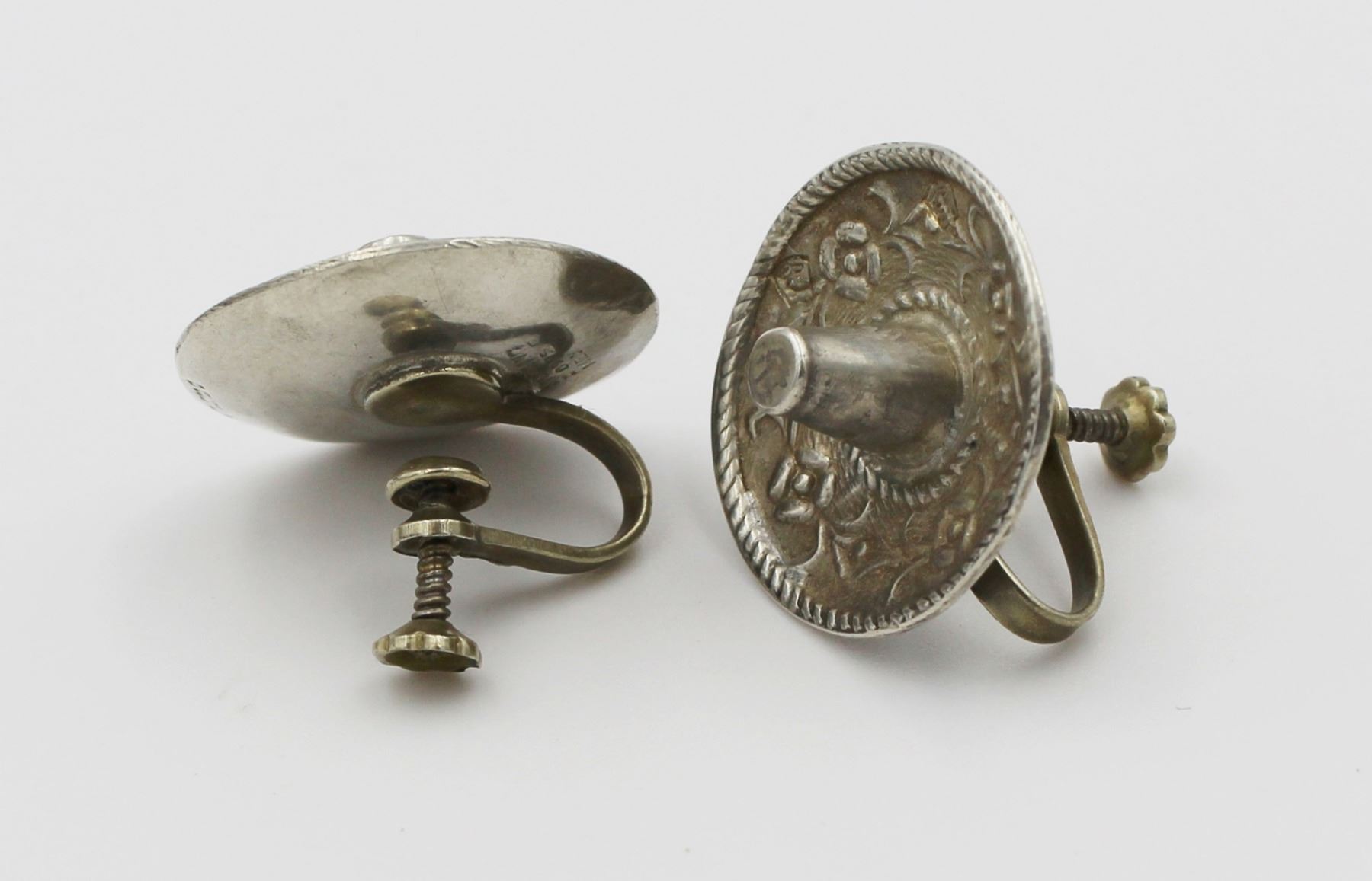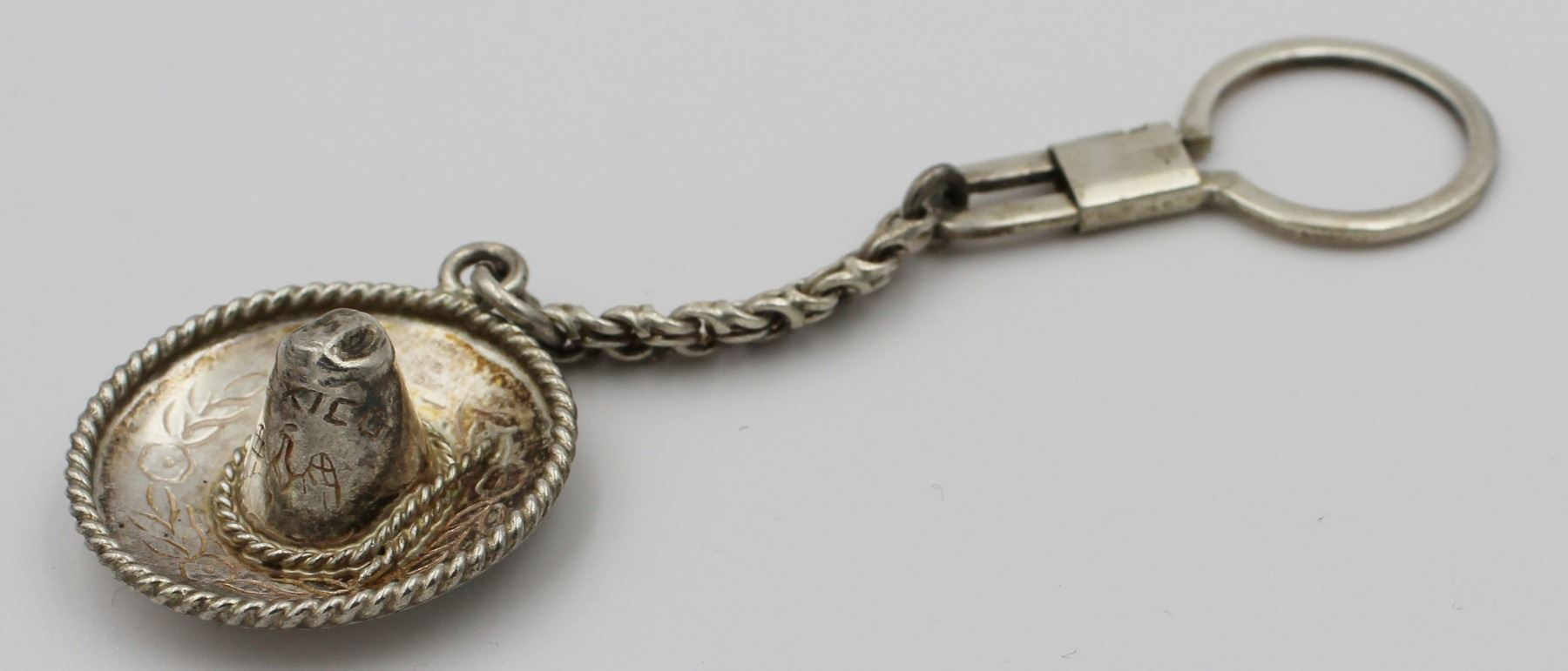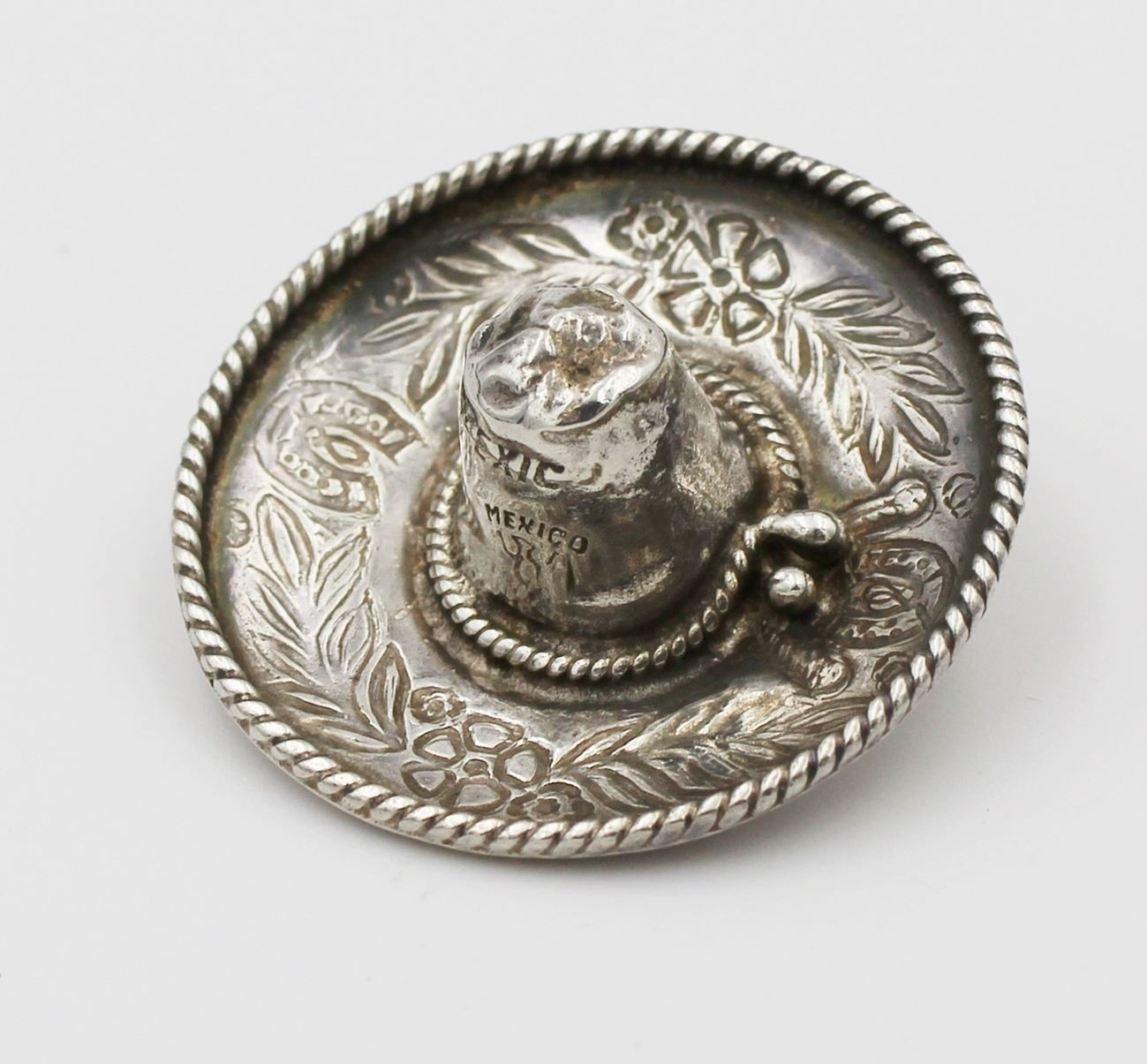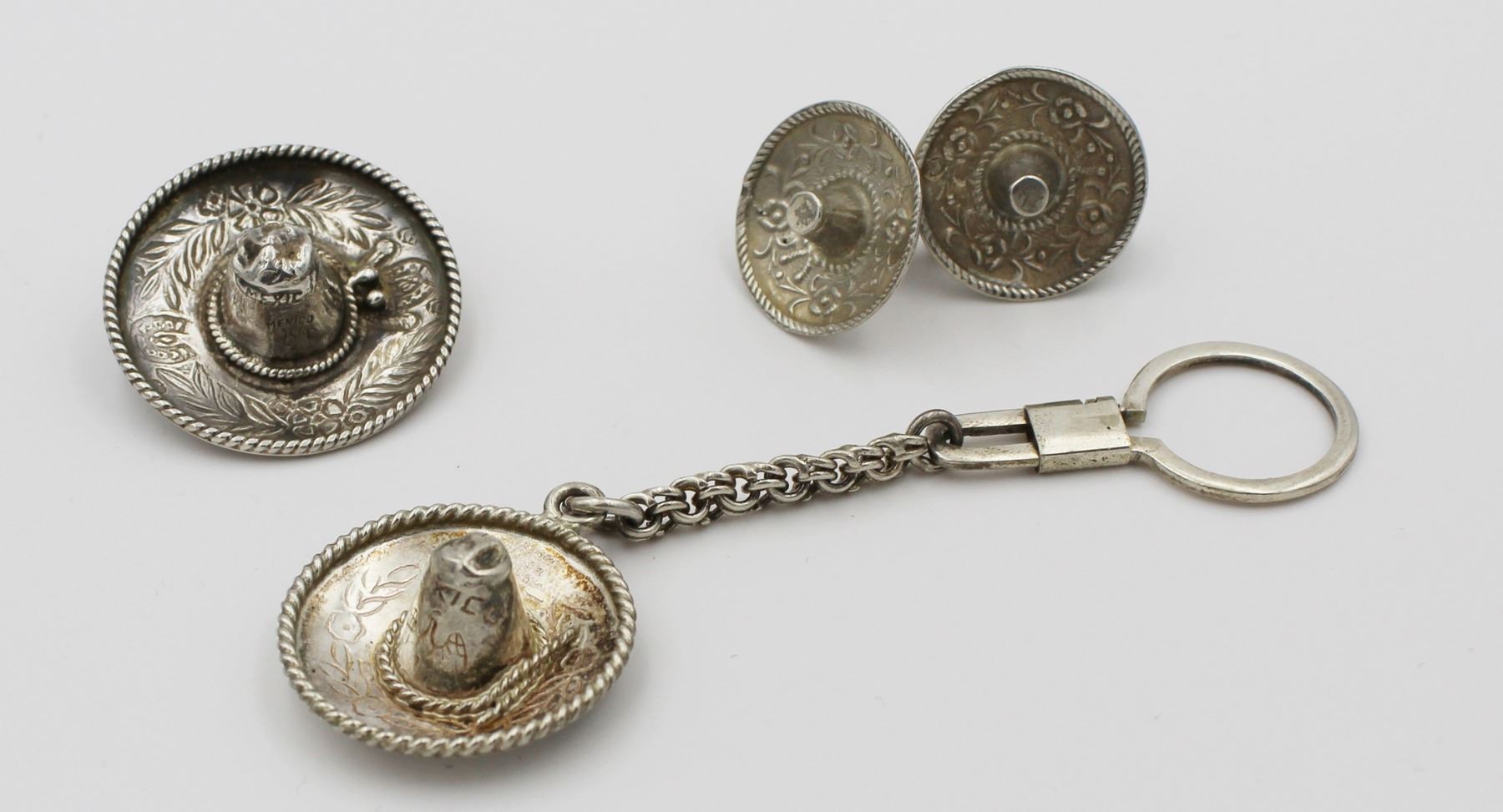 MEXICO .925 SOMBRERO SET. INCLUDES KEY CHAIN, PIN AND TWIST BACK EARRINGS. EARRINGS ARE SIGNED "SELGADO". PRE-OWNED. 24 GRAMS TOTAL. ESTIMATE:$150-$200