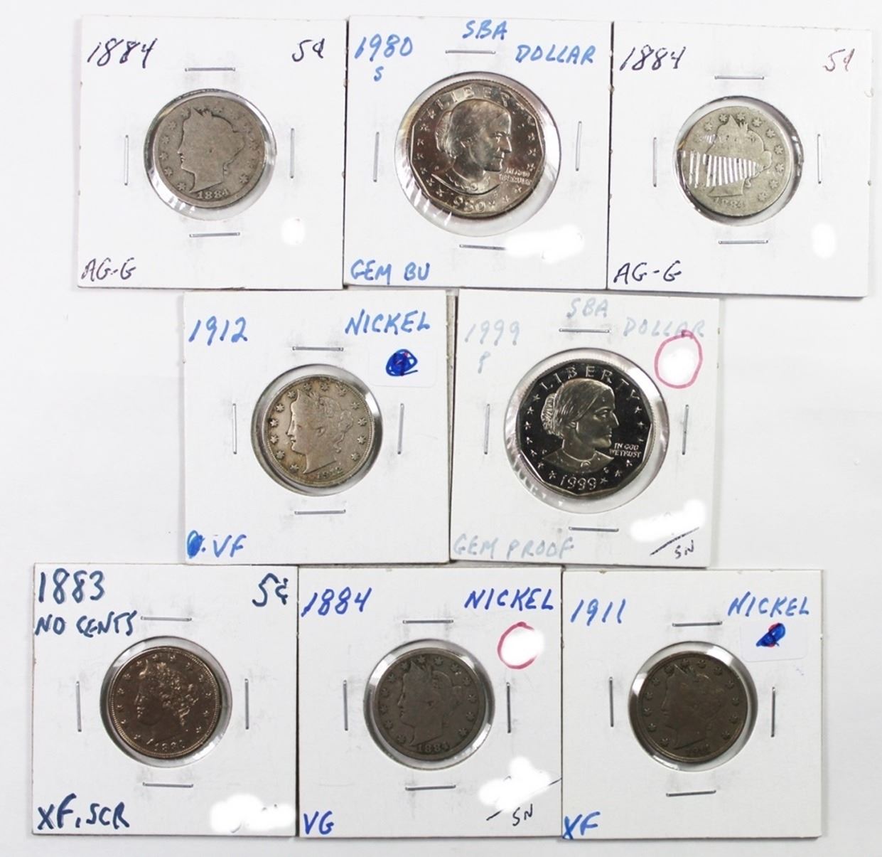 NICKELS: TWO 1884 AG/G, 1912 VF, 1911 XF, 1884 VG+, AND 1883 NO CENTS XF. SBA DOLLARS: 1980-S BU AND 1999-P GEM PROOF. ESTIMATE: $85-$115