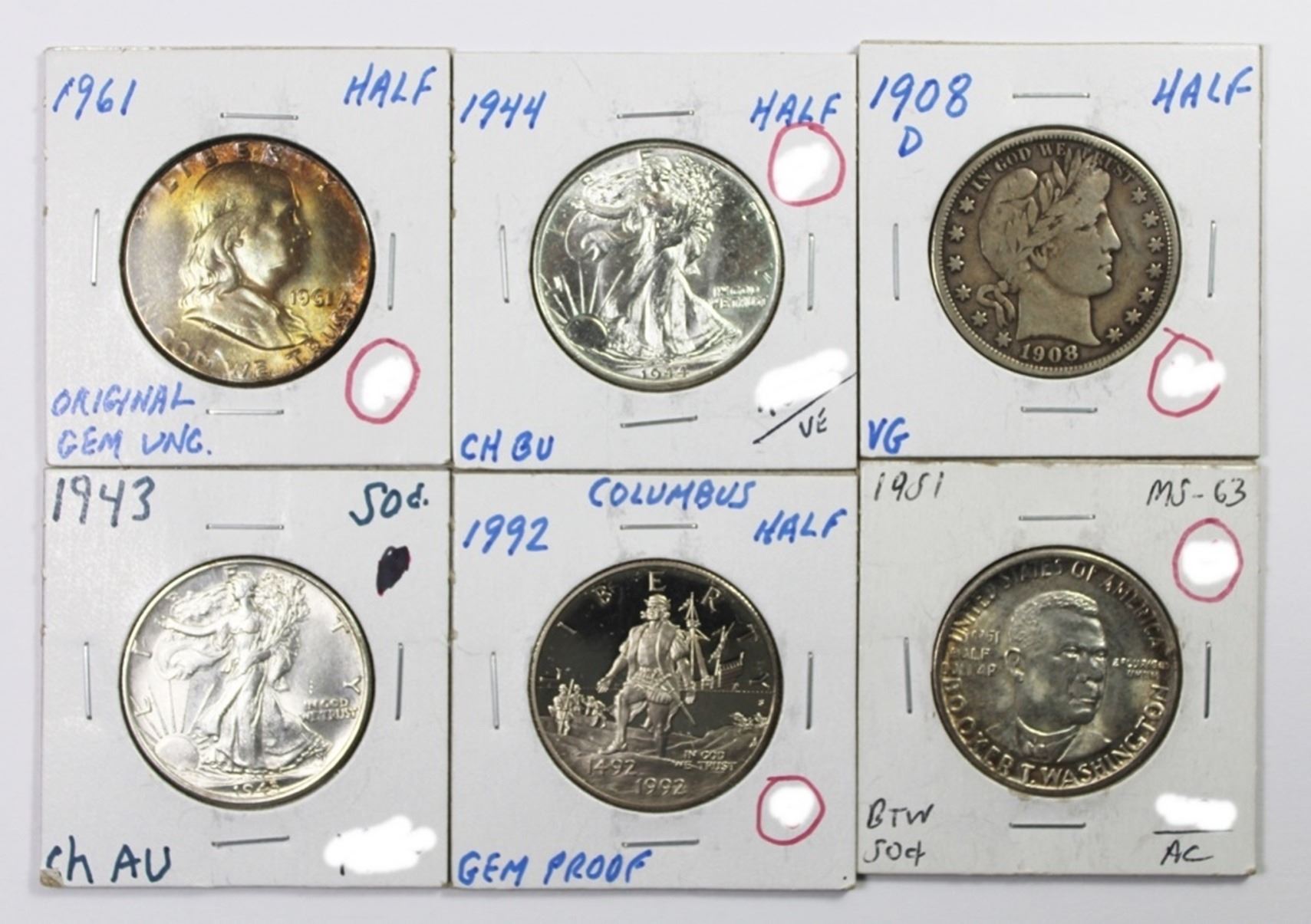 1943 CHOICE AU; 1944 CHOICE/GEM BU; 1951 BOOKER T. WASHINGTON GEM BU; 1961 GEM UNC COLOR; 1992 COLUMBUS PROOF; AND 1908-D VG++. ESTIMATE: $125-$150