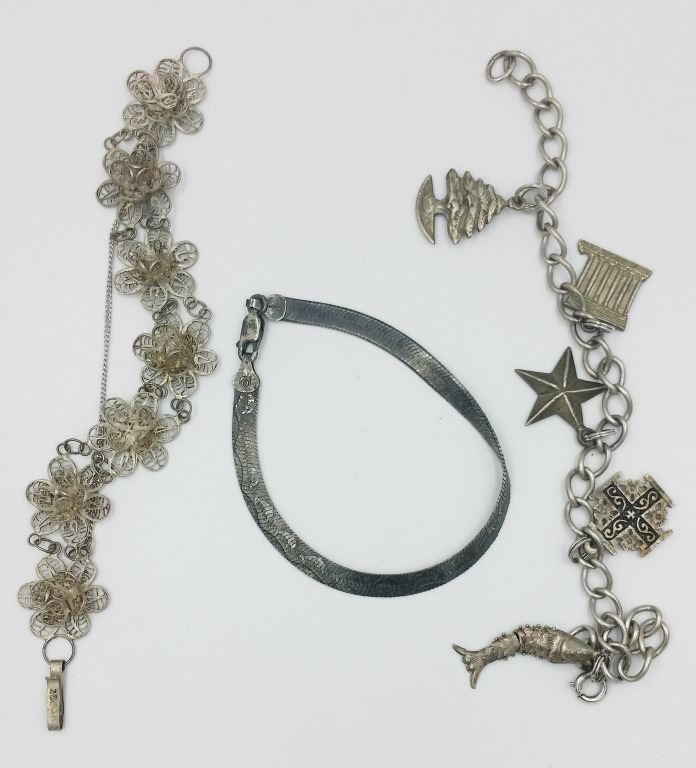 PRE-OWNED, ONE CHARM BRACELET WITH 5 CHARMS, SEE PHOTOS, 34 GRAMS. ESTIMATE: $50-$75
