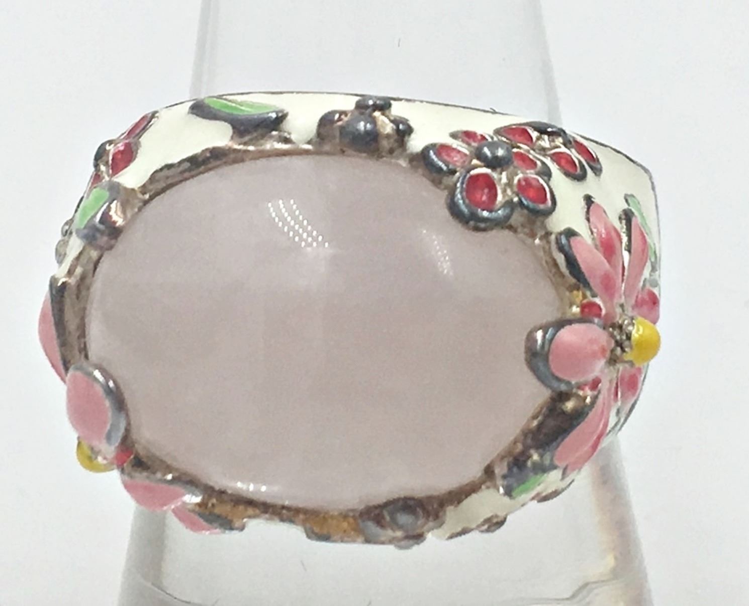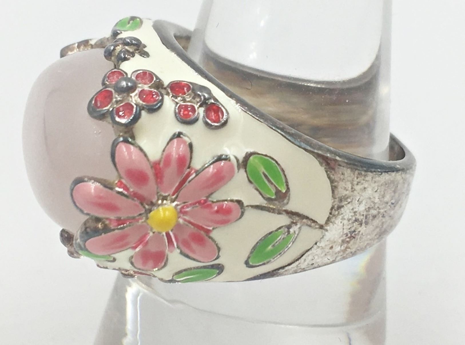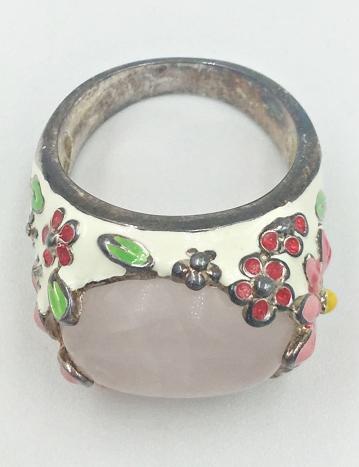 STERLING SILVER ROSE QUARTZ ENAMEL FLOWER RING--SIZE 9 1/2 SIGNED SIGAL .925 MESH DESIGN RING WITH LILAC COLORED STONE. PRE-OWNED. SEE PHOTOS. ESTIMATE:$ 75-100